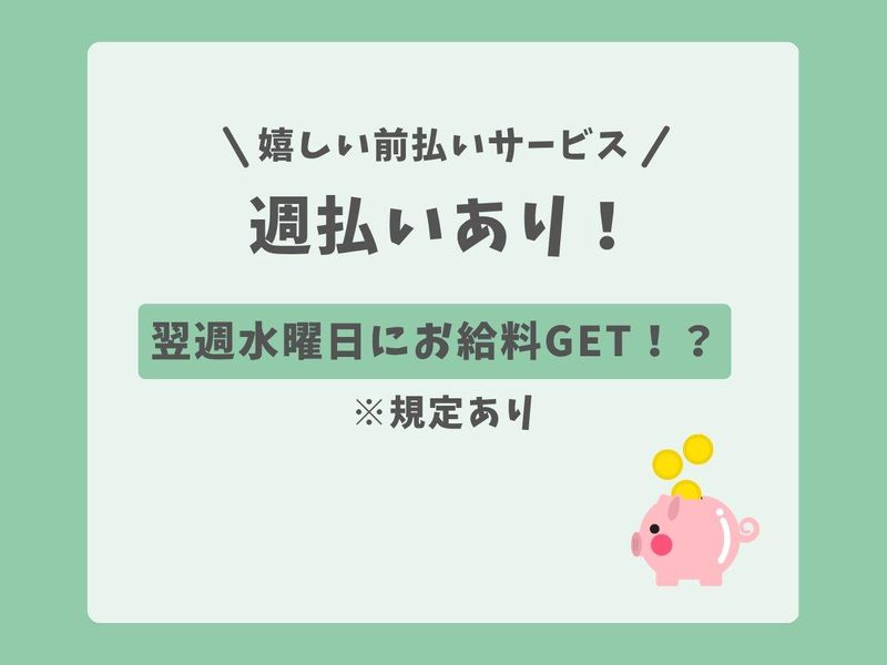 時給1,130円 給与詳細 基本給:時給 1130円 時給:1,130円 交通費:1勤務あたり500円支給(規定あり) ◆週払い制度あり!勤務翌週にお給料が受け取れて安心♪ ◆扶養内勤務もOK!家庭と両立したい主婦(夫)さんにも◎ ◆Wワークにも最適!朝だけ・夕方だけの勤務OK♪ 【給与例】 給与例 【給与例】 1. ガッツリ週5日勤務♪ ◆時給1130円 × 4時間 × 21日=約94920円 2.扶養内で週3日勤務♪ ◆時給1130円 × 4時間 × 13日=約58760円