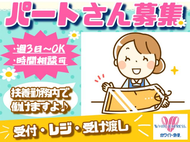 仕事内容 クリーニング店舗で受け付けのお仕事。 ホワイト急便の店舗で働いていただける パート/アルバイトさんを募集しております。 未経験の方や初心者の方も始めやすく 20代・30代・40代・50代など 幅広い年齢の方が在籍・活躍しております。 【募集職種】 ・店舗スタッフ (アルバイト・パート) <主な業務> 接客(来店されたお客様の対応) 商品のお預かり、引き渡し、レジ操作など。 来店されるお客様は馴染みの方が多く とても優しい方ばかりです! 最初は先輩スタッフのサポートに回り お仕事の流れや注意点、レジ機の操作などを 勉強していただきます。 先輩たちが親切丁寧にご指導いたしますので 不明点などあればお気軽にご質問ください。 【ライフスタイルに合わせて働けます】 〇働く日数や時間帯は選べます。 週3日~働くことが可能! ・週5日でしっかり稼ぎたい主婦(夫)層 ・午後から働きたいアルバイトさん ・ダブルワークや副業をしたいパートさん ・空いた時間を有効活用したい中高年世代の方 など、様々なライフスタイルに対応OK! 〇時間帯も選べます。 常勤や扶養内勤務など ご都合に合わせた働き方ができます。 〇主婦(夫)パート層もご安心ください お子さんの行事や急なお休みなど対応可。 家庭と仕事の両立がしやすい点もお勧め! ご希望の働き方がある方や クリーニング店で勤務経験ある方、 短時間で働きたい方などなど、 皆様からのご応募心よりお待ちしております。