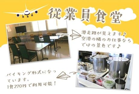 仕事内容 従業員用の食堂ないの調理業務をお願いします。 従業員専用の食堂です。 機内食製造工場で働く人たちを支える、従業員食堂のお仕事です。 滑走路も見える食堂内で、ちょっとワクワクする環境が魅力です。 選べる通勤方法! 交通費全額支給! お家から通勤しやすい方法をお選びください。 ■JR直結! 札幌方面からJR一本! 空港まで駅直結なので通勤しやすいです♪ 他にも、苫小牧方面から乗り換え1回で来ることも可能です。 ■市内からリムジンバス一本で通える! 札幌市内から7:30勤務時間希望の方は北斗交通リムジンバスの利用がおすすめ♪ 札幌駅前→月寒中央駅前→清田団地入口→三井アウトレットパーク入口→新千歳空港着 他の停車場所に関して、知りたい方はお電話ください。 ■もちろん車通勤もOK! 機内食工場の食堂調理のお仕事 機内食を作っている工場内にある、社員食堂の厨房業務をお願いします。 ・従業員の昼食準備 ・調理全般 ・厨房内清掃 等の作業をおねがいします。