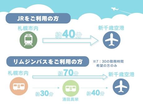 アクセス 連絡バス 新千歳空港徒歩約11分、JR千歳線 新千歳空港徒歩約12分、JR石勝線 南千歳南口徒歩約43分 ■公共交通機関でアクセスしやすい!駅直結の新千歳空港