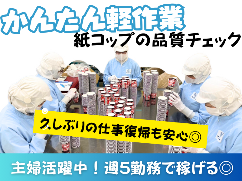 仕事内容 ◆ここがポイント―+―+―+―+―+ ・20~30代の主婦さん活躍中! ・久しぶりの仕事復帰大歓迎◎ ・週5日勤務で月収14万円以上可能 ・社会保険完備で長期安定勤務 ・エアコン完備の快適な職場 ・残業ほぼなしで家庭との両立も◎ +―+―+―+―+―+―+―+―+― 「久しぶりの仕事復帰で不安…」 そんなあなたにもピッタリ! 私たちと一緒に、安心・安全な 紙コップを届けるお仕事をしませんか? <仕事内容> キズや汚れがないか、印字は正しいか… などを目視で確認する、 シンプルでコツコツできる作業です。 座り作業が中心なので、 体力的な負担も少なめ◎ <具体的には> 午前:目視検査(座り作業) ▽ 午後:袋詰め ▽ 生産ラインに流すだけの簡単作業♪ 「これなら私にもできるかも…」と 思ったら、ぜひ一度ご連絡ください! ◎5~6人で1つの作業台で作業します。 モクモク作業ですが、チーム内で ほどよく会話があるので、 楽しく働くことができます。 わからないことがあれば すぐに質問できたり、急なお休みも 相談しやすい環境です。 ================= ✅アピールポイント ================= ✨未経験でも安心 「品質チェックって難しそう…」 そんな心配は不要です! 先輩スタッフが丁寧に教えます。 一つ一つ確認項目を覚えていけばOK なので、自分のペースで慣れていけます。 ✨コツコツ、黙々作業が好き 集中して作業に取り組めるので、 あっという間に時間が過ぎます。 自分のペースで進められるので、 プレッシャーを感じることもありません ================= ✅主婦に優しいポイント ================= ✨エアコン完備で快適な職場 一年を通して快適な環境で、 集中して作業に取り組めます。 ✨家事との両立もラクラク 勤務時間は9:00~16:00で 残業はほとんどありません。 平日のみの勤務もOKなので、 土日はしっかり家事に専念できます。 ✨20名のパート・アルバイトのうち なんと15名が子育て中のママさん! 当社の職場は、子育て世代の女性が多数 活躍しています。同じ境遇の仲間が 多いからこそ、悩みや不安を 共有しやすく、心強い環境です。 ✨急なお休みにも対応します! お子様の急な発熱や、ご家庭の都合で どうしても休まなければならない時も 遠慮なくご相談ください。 アットホームな雰囲気で、困った時は お互いに助け合う、温かい職場です。 ✨時間のない朝も大丈夫! 帽子とマスク着用で目しか出ていないため、 すっぴんで出社OKです。 ================= ✅こんな方にオススメ! ================= ✨週3~4日程度で、家事や育児と 両立しながら無理なく働きたい 勤務日数や曜日など、あなたの ライフスタイルに合わせて 柔軟に対応します。 お気軽にご相談ください。 ✨オフィスワークはちょっと苦手… 体を動かす仕事が好き! 当社の紙コップの品質チェックは、 座り作業が中心ではありますが、 適度に体を動かす作業も含まれています 気分転換にもなり、メリハリを つけて働けます。 ✨PCスキルに自信がないから、 PCを使わない仕事を探している パソコン操作は一切不要! 難しいスキルは必要ありません。 ================= ✅先輩スタッフからの一言 ================= 子どもが熱を出して、急遽帰らなくては ならなくなった時、柔軟に対応して くださり、とても助かりました! 主婦の方が多い職場なので、 理解があり、働きやすい環境です◎ 事業内容:流通加工業