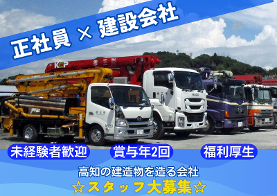 仕事内容 \\\\||||||||||//// 月給30万~35万 賞与年2回+退職金制度有り 年間休日129日 資格支援あり 無線操作のポンプ車で安全性◎ 未経験はOJT3か月で基礎から習得 コンクリートを圧送し歴史に残る建造物を造っています! ////||||||||||\\\\ 【どんな会社?】 創業約40年、コンクリートによって、ビルや橋、マンションを作ってきました! 安心、安全を第一に仕事を行い、高知の市役所、オーテピア、安芸への高速道路など大きな仕事をいただいております。 私たちの仕事は数十年、数百年の先まで残る建造物を作る仕事です!今の時代はほとんどの建造物にコンクリートが使われており、仕事を通じて歴史と文化に携わっていることが実感できる仕事です! 縁の下の力持ちの仕事なので、働くイメージがしづらい方はお気軽にお問い合わせください^^ 《具体的な仕事内容》 ポンプ車で現場へ行き、ポンプ車の設置、生コン圧送する作業を行って頂きます。 作業後はホースの清掃などを行います。機械操作をする仕事も多いので、慣れてしまえば初心者でもすぐに覚えられる仕事です。 ※足場の設置などは他社様が行っております。 最初の3ヶ月は研修期間となります。最初は既に現場で働いている先輩にならって移動や、圧送の作業を学んでいただきます。 先輩が必ず付きますのでいきなり現場に1人といったような事はございません。 未経験の方でも学べる環境です。 1日の流れ 7時出勤~現場移動 ポンプ車設置、圧送作業 昼休憩 ポンプ車清掃作業 16:00退勤 ※フレックス制度を導入しています。 アピールポイント 【未経験者歓迎/賞与年2回支給】 公共工事のご依頼もいただいており、市役所、オーテピア、病院、安芸までの高速もご依頼いただいています。 現場の建物が完成すると「この建物は自分が建てたのだ」と思ってしまうくらい思い入れの深い仕事ができます。 最新のポンプ車等を導入し、無線操作等も行えますので安全な現場です。 機械の操作については先輩がついて教えますので初心者でも安心して働けます! ・賞与年2回支給。日々の頑張りをしっかり評価します^^ ・社会保険あり/退職金制度ありで安心して長く勤務できます。 ・制服貸与あり。入社後すぐに現場で働ける環境です♪ ・マイカー通勤OKです! 少しでもご興味のある方は、ぜひお気軽にお問合せください!