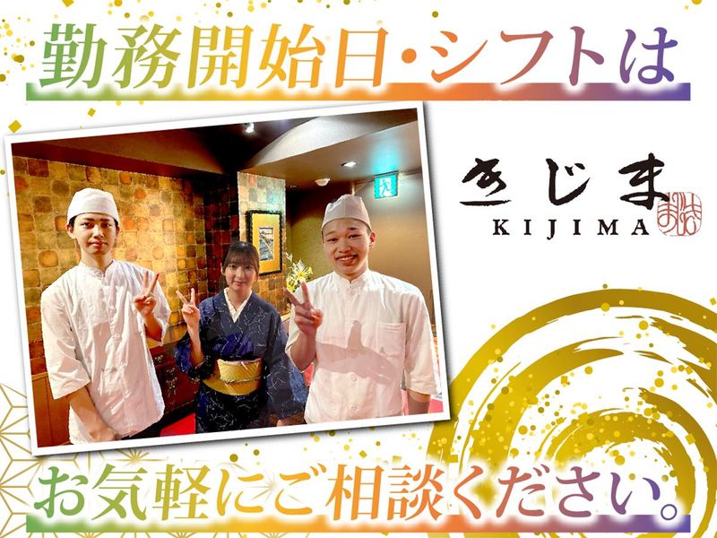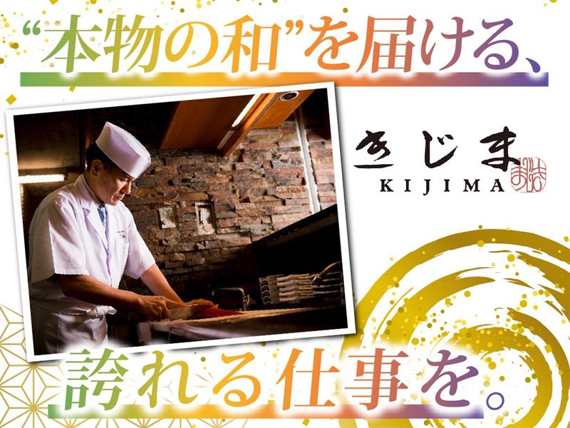 職場環境 「きじま」は1980年創業、今年44年目を迎えます。 創業当時から「お客様に獲れたての海の幸を味わっていただきたい」という想いから活魚を直接買い付けています。当店名物の「海幸盛」は創業当時からお客様に支持され続けており、今でも”特別なお料理”のひとつです。