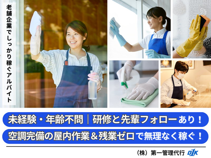 仕事内容 【この求人のポイント】 ①学生&未経験歓迎: 先輩帯同&マニュアル充実。 初出勤日から1〜2週間はOJTで、慣れるまでつきっきりで先輩が教えます! もし悩んでもいつでも聞ける体制です。 ②固定シフトで生活安定: 7:00〜16:00(休憩あり)。 7:00〜11:00・12:00なども調整可能。 夕方からは私用に充てやすい環境です! ※長期休みの取得も可能です。 ③無理せず稼げる: 時給1,250円で、シフトは最低週3日から。 生活に合わせて始められます。 ー 【業務内容】 ・共用部のそうじ: 廊下/階段/入口をモップとクロスで拭き上げ→ゴミ回収 ・トイレのそうじ: 個室/洗面/鏡/ドアノブの拭き掃除と、ペーパー・ソープの補充。 ・更衣室のそうじ: ロッカー前/ベンチ/床/ドアノブの拭き掃除→ゴミ回収 ー 【会社概要】 株式会社第一管理代行は1966年に東京都千代田区で創業し、総合ビルメンテナンス企業としてマンション管理、清掃管理、医療関連、設備運転保守、保安警備まで一気通貫でサービスを提供してきました。 半世紀を超える運用ノウハウを背景に、リーマンショックやコロナ禍でも、現場の継続稼働と快適性向上を両立することで、堅調な成長を実現してきました。 ー 【当社で働く魅力】 1|なぜ定時で帰れるのか? 7:00〜16:00でキリよく終了。 マニュアル完備+先輩帯同だから、簡単な作業からスタートできます。 1〜2週間はOJTで、じっくりと教えます。 手順が決まっている分迷う時間が少なく、夕方以降は講義・部活・ジムなどのプライベートに充てられ、生活リズムが乱れません! 2|“覚えやすい”から続けやすい 担当エリアと順路が決まっているから、覚えるほど速く・楽に。 今日やることが毎朝わかる働き方です! 3|“週3日〜OK”でスタートしやすい 授業・テスト・家庭の予定に合わせて日数調整が可能。 まずは週3日から始めて、慣れたら増やすのも歓迎。 続けやすい=収入が安定しています!