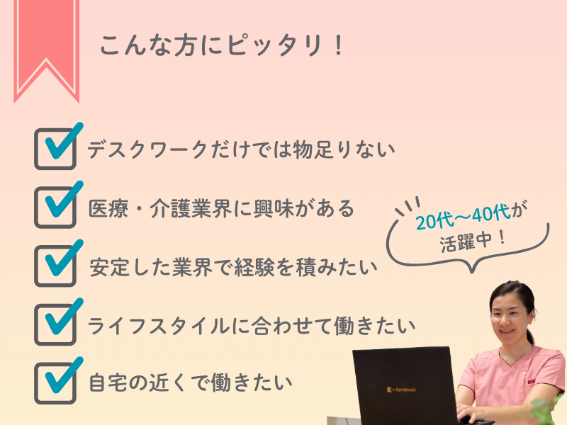 求めている人材 \\20代・30代・40代活躍中!// 【必須】 ■事務職の経験がある方 ■PCの基本操作ができる方 ・Wordを使用した文書作成 ・Excelへのデータ入力 ・社内・社外へのメールやりとり など >>以下にあてはまる方、大歓迎です! - ■入居者様、ご家族に寄り添える方 ■職場内でコミュニケーションをとり 仕事を進めていける方。 ■医療や介護の現場で働くことに 興味がある方