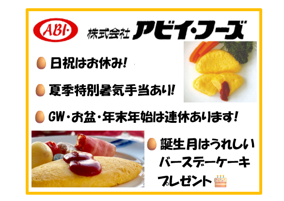 ■勤務先 株式会社アビイ・フーズ 〒891-0131 鹿児島県 鹿児島市谷山港2丁目1番3号 ※アクセス情報: 車・バイク通勤可(駐車場無料)