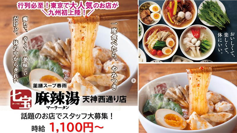 ■仕事内容 \SNSなどで話題の七宝麻辣湯が九州初出店! 未経験でもOK!飲食店店舗の立ち上げを経験できます! ※週0日~、1日2時間~勤務OKです。 【具体的な仕事内容】 <ホール> ・お客様への注文システム説明 ・お客様の注文を専用の端末で受けとり ・料理をお客様のテーブル配膳 ・退席されたテーブルの片付け <キッチン> ・調理(スープをつくる、野菜を切る、具材を茹でるなど) ・簡単な盛り付け ・食器などの洗浄 ・簡単な仕込み作業 【アピールポイント】 ・オープンしたばかりの店舗!運営業務に携わることができます ・2026年に創業100年を迎える安定企業です! ・週0日~、1日2時間~OK!扶養内・フルタイムに近い働き方もOKです ・入社後研修あり!調理、飲食業、接客業のご経験がない方でもご安心ください ・立ち上げメンバーには弊社先輩スタッフがいますので、一緒にお店を作っていきましょう! ・FC店ならでは、マニュアル完備なので難しい工程はいっさいありません! ・調理内容も分量が決まっているので簡単!野菜を切ったり茹でたりする工程がメインです。 【入社後の流れ】 まずは担当者からのオリエンテーションの後、座学や動画視聴を通して七宝麻辣湯の事業内容の理解を深めるための研修を行います。 その後、OJTでホールやキッチン業務を学びます。 あなたの経験やスキルに応じて、研修期間は1ヶ月を目安に柔軟に調整していく予定です。 ホールやキッチン業務を習得していただいた後、店舗運営管理業務へとステップアップしていただきます! ~七宝麻辣湯(チーパオマーラータン)とは~ 美味しく食事しながら身体を内側から元気にする、「美容健康・医食同源」をコンセプトにトッピングや辛さが選べるスパイシーなスープ春雨を提供しています。 男女とわず、健康に気を配っていらっしゃるお客様を中心にとても愛されているフードプレイスです。 50品目を超えるトッピングがあり、辛さも自由に選べるので、リピーターのお客様もたくさんいらっしゃいます! 【こんな方は歓迎します】 ・スキマ時間に働きたい方 ・授業の合間や学校終わりに働きたい学生さん ・子育てが落ち着いた主婦(夫)さん ・安定した経営基盤の企業で働きたい方 ・仕事とプライベートを大切にしたい方 ・調理経験のある方 ・未経験歓迎、初心者OK ・ブランクがある方も歓迎 ・飲食店、レストラン、カフェ、喫茶店、居酒屋、料亭、接客、販売、スーパー、コンビニなどの勤務経験も活かせます。 ・ハローワークでお探しの方も歓迎します。 ■仕事の特徴 駅チカ・駅ナカ 友達と応募OK フルタイム歓迎 扶養内勤務OK 長期歓迎 副業・WワークOK シフト制 土日祝のみOK 短時間勤務OK 学歴不問 未経験・初心者OK ブランクOK 資格不問