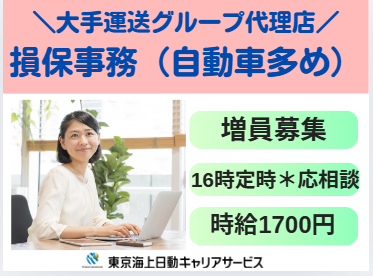 仕事の内容 \自動車多め×異動変更手続きメイン/ ◆チームで対応!ご経験生かして大手企業Gで活躍◎ ◆9時~17時定時 └~16時までや、~18時までなどの時間の相談受付中 【基本情報】 雇用形態:派遣社員 雇用期間:長期(3カ月以上) 2月~開始日相談可能 就業時間:9:00~17:00(休憩60分) 【必須条件】 ◆パソコン:基本操作(入力~修正) 【お仕事内容】 ※取り扱い:損保ジャパン・東京海上日動・三井住友海上・あいおいニッセイ同和・楽天・共栄 火災 ※種目:自動車(メイン)・火災・傷害 ・異動・変更手続き(メイン) ・ 見積・申込書作成~発送 ・返却書類内容チェック~不備訂正 ・計上 など ◆繁忙期は1月〜4月半ば! 【こんな方にオススメ】 ・保険のキャリアを再スタートしたい ・ある程度流れの決まった業務が好き ・フルタイムでも家庭とムリなく両立したい 【環境面等】 ・@新富町駅から徒歩圏内 ・大手運送グループ企業の保険部門です ・30代・40代・50代・60代の多い職場 └幅広い年代活躍中/子育てに理解ある主婦(夫)が活躍中 ・ブランク活躍中! ・オフィスカジュアル内で服装自由 └個人ロッカーあり 【福利厚生等】 ・ランチタイムは休憩スペース利用OK └冷蔵庫使用OK!お弁当持参OKです/社員食堂あり ・社会保険完備 ・禁煙オフィス!煙苦手な方も安心 ・平日のみOK!土日祝休み ・年間休日120日以上&お休み相談可 └有給休暇 ・時間もムリなく調整できるから、家庭やプライベートとの両立も◎少しでも気になった方は、ぜひお気軽にご応募ください♪ ○●嬉しいPOINTたくさん!●○ 履歴書不要!開始日相談OK/長期/ブランクOK/月収例23万円以上/社保完備/17時退社/7時間以内勤務/時間応相談