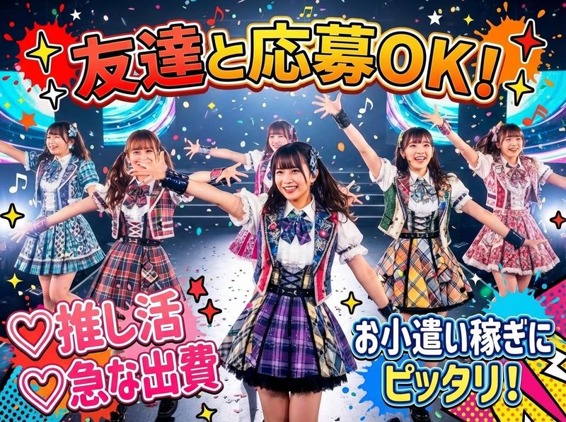 仕事内容 ※※ご応募前にご確認ください※※ 本求人は高校生(18歳未満)の方は ご応募いただけません。 (労働基準法/夜勤勤務が必須のため) 今年3月に高校を卒業された方も 3月末日まで高校在籍となります。 【イベント内容】有名アイドルのライブイベント / ⭐大学生・フリーターがメインで活躍中! ⭐シフト自由!!週0日もOK!! ⭐早く終わっても日給保証 ⭐5回目の勤務でボーナス5000円!(給料日支給) \ ✧・:・。✧・:・。✧・:・。✧・:・。✧・:・。✧・:・。✧ ✨3秒でわかる!このバイトの魅力✨ ✧・:・。✧・:・。✧・:・。✧・:・。✧・:・。✧・:・。✧ ✅ 激レア体験が待ってる! 有名アーティストのライブやアニメの イベントなど、普段は見られない 「裏側」で活躍!同年代の仲間と、 忘れられない思い出を作ろう! ✅ 超柔軟シフトでプライベートも充実! 「今週は週0、来週は週5」 「授業後だけ」もOKな完全自由シフト 。 履修登録やテスト期間、Wワークの予定 にも100%対応します。 ✅ 履歴書不要&オシャレ自由! 髪色・ネイル(※規定あり 長さ0.5cm前後 ご相談ください)ピアス自由で、 自分らしく働けます 。 思い立ったらスマホひとつですぐに 応募できる手軽さも魅力です。 [仕事内容] イベント会場の ステージや客席、関連ブースの 片付けなどをお願いします 。 イベント会場がゼロから組み上がる 様子は圧巻!チームで協力して一つの 空間を作り上げる、達成感バツグンの お仕事です。 先輩スタッフが丁寧に指示するので、 未経験でも全く問題ありません 。 ✧・:・。✧・:・。✧・:・。✧・:・。✧・:・。✧・:・。✧ ✨ 応募方法 ✨ ✧・:・。✧・:・。✧・:・。✧・:・。✧・:・。✧・:・。✧ ~公式LINEから応募可能!~ QRコードもしくは下記IDをご登録の上、 応募した勤務地名とご希望の日程をお知らせください★ ▷ID:875cvfww ▷URL:https://lin.ee/9ljyK4p ~webの場合~ 応募ボタンをクリック(1分で完了) 弊社からお電話 (03-6733-7324) にてご連絡します。 ~電話の場合~ 番号:03-6733-7324 『求人を見た』とお伝えください。