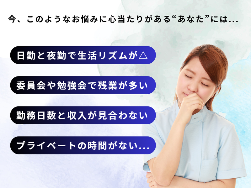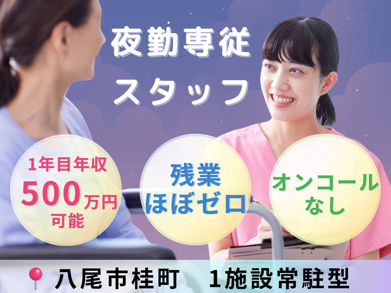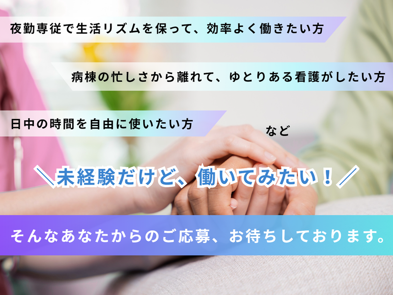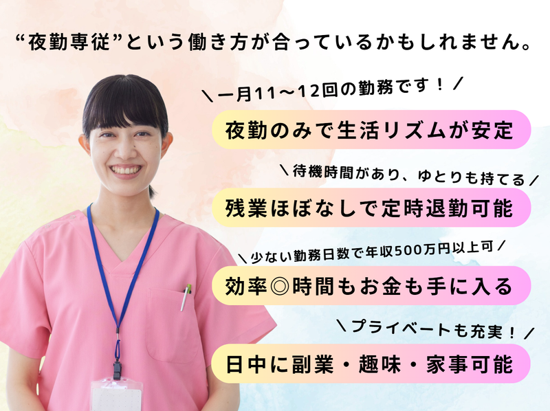 仕事内容 ✨求人point✨  ̄ ̄ ̄ ̄ ̄ ̄ ̄ ̄ ̄ ̄ ̄ ̄ ̄ ̄ ̄ ̄ ✅月給38.2万円~+賞与年2回 ✅初年度から年収500万円以上も可! ✅副業・WワークOK◎ ✅住宅型有料老人ホームでの夜勤専従 ✅オンコール対応なし!施設常駐で安心 ✅月11~12回勤務!休憩も2時間あり ✅40代・50代活躍中♪ ◢◤お仕事内容◢◤  ̄ ̄ ̄ ̄ ̄ ̄ ̄ ̄ ̄ ̄ ̄ ̄ ̄ ̄ ̄ ̄ 「日勤フルタイムで働いても、給料がそこまで上がらない…」 「夜勤明けの日中は自分の時間に使いたいのに、日勤もあると難しい…」 「副業したいけど、今の職場じゃ時間がない」 「もっと効率よく稼いで、プライベートも充実させたい!」 そんな風に思ったことはありませんか? 実は、そのモヤモヤ、"夜勤専従"という働き方で解決できるんです! 夜勤専従なら、こんな働き方ができます ◎月11~12回勤務で月給38万円以上! ◎年収500万円以上も十分可能 ◎日中は完全フリー(副業・趣味・家事・資格取得など) ◎フルタイム日勤より効率的に稼げる お仕事は、基本的には待機で、指定の時間に医療処置(注入、インスリン投与、点滴など)を行います。 <1日のスケジュール例> 夜勤 18:00|出勤・日勤看護師からの申し送り ▼ 18:30|医療処置対応や見守り ▼ 21:00|消灯、夜間は主に待機状態 ▼ 深夜|ナースコール対応や必要な医療ケア、休憩(120分) ▼ 6:00|バイタルチェックなど健康チェック ▼ 7:30|医療処置・緊急対応休憩 ▼ 8:30|日勤看護師への申し送り ▼ 9:00|退勤 ヘルパーさんからの相談があれば都度対応し、食事介助や巡回は行いません。 夜は緊急対応や医療行為が主な役割で、状況に応じて動く形です。 また、施設常駐なので、オンコール対応はありません! #夜勤専従ならではの働きやすさ!  ̄ ̄ ̄ ̄ ̄ ̄ ̄ ̄ ̄ ̄ ̄ ̄ ̄ ̄ ̄ ̄ ◆ 日中の時間を自由に使える! ・月11~12回の夜勤でプライベートも充実 ・朝9時退勤で日中は完全フリー ・副業OK(訪問入浴、デイサービス、派遣など) ・趣味や資格取得の時間も確保 ・家事や買い物もゆっくりできる ◆ 夜勤専従ならではの高待遇! ・月給38.2万円〜(正看護師) ・月給33.2万円~(准看護師) ・賞与年2回あり ・年収例:正看護師 458万円~(賞与別) ◆ 安心して働ける環境! ・住宅型有料老人ホームでの施設常駐勤務 ・ヘルパーさんとの連携体制バッチリ ・オンコール対応なし ・残業ほぼなしで、定時で帰れる \こんな方におすすめ/  ̄ ̄ ̄ ̄ ̄ ̄ ̄ ̄ ̄ ̄ ̄ ̄ ̄ ̄ ̄ ̄ ・効率よく稼ぎたい方 ・日中の時間を自由に使いたい方 ・副業やWワークをしたい方 ・フルタイム日勤より夜勤専従の方が合っている方 ・日勤と夜勤で生活リズムが不安定な方 ・40代・50代で活躍したい方 ・ストレスフリーな環境で働きたい方 「夜勤専従で生活リズムを保って、効率よく働きたい」 「病棟の忙しさから離れて、ゆとりある看護がしたい」 「自分のペースで無理なく、でもやりがいを持ってしっかり稼ぎたい」 そんな方にピッタリの職場です。 まずはお話ししてみたい、というだけでも全く問題ないです。 お気軽にご応募ください♪