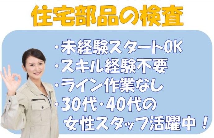 仕事内容 ●住宅に使う部品の検査 ※見本通りに組立がされているかの目視検査や ノギスと呼ばれる測定器を使用してサイズの確認をします ○人気の検査のお仕事! 住宅につかう部品・製品の検査なので 細かなものはありません! 手先が不器用という方も心配不要♪ 今までに検査業務の経験がある方は採用面で優遇! ご経験のない方もお仕事内容にご興味があれば ご応募OK! 現在30~40代の若い世代が多く活躍中! 社員登用実績もあるので行く行くは派遣ではなく 正社員や直接雇用を希望されている方にもオススメ! ○土日祝休み!長期休暇もあり! 働きやすい土日祝休みのお仕事! 繁忙期に土曜日の出勤が月に1~2回程度 ありますが年間カレンダーで決まっているので 予定も立てやすくて安心♪ GWやお盆、年末年始の連休あり! ===ここもチェック!=== ■急募 ■即日勤務OK ■長期休暇あり ■社会保険完備(雇用保険、健康保険、厚生年金) ■健康診断あり(年1回/会社負担) ■交通費支給 ■制服・作業着貸与 ■残業月20時間以内 =================