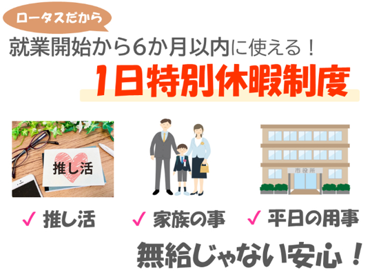 職場環境 ※職場の環境 ・20代活躍中 ・30代活躍中 ・ロータススタッフさん活躍中 ・女性多め ・禁煙、分煙 ・服装自由 ・スニーカーOK ・ジーンズOK ・冷蔵庫あり ・電子レンジあり ・フリードリンク有 禁煙、分煙
