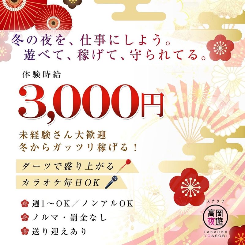福利厚生・加入保険 【待遇・福利厚生】 ◆ シフト完全自由制 ┗1日3時間~OK、週1回や月1回だけでもOK! ◆ 全額日払い ┗働いた分はその日に受け取れます! ◆ 1日体験OK ┗お仕事を試してから決められます! ◆ 送迎あり ┗時間問わず、どんなに遠方でも対応します。 ◆ 鍵付きロッカー完備 ┗安心してお荷物を保管できます。 ◆ 無料制服あり ┗希望者はボトム自由でおしゃれも楽しめます! ◆ 友達紹介キャンペーンあり ┗お友達を紹介すると嬉しい特典が! ◆ バースデープレゼントあり ┗お誕生日には特別なプレゼントをご用意。 ◆ 時給2,000円から3,000円 ┗さらにボトルバック、同伴バックなど各種インセンティブも充実! 週末出勤すると時給アップも魅力的のひとつです。 楽しく安心して働ける環境が整っていますので、ぜひご応募ください!