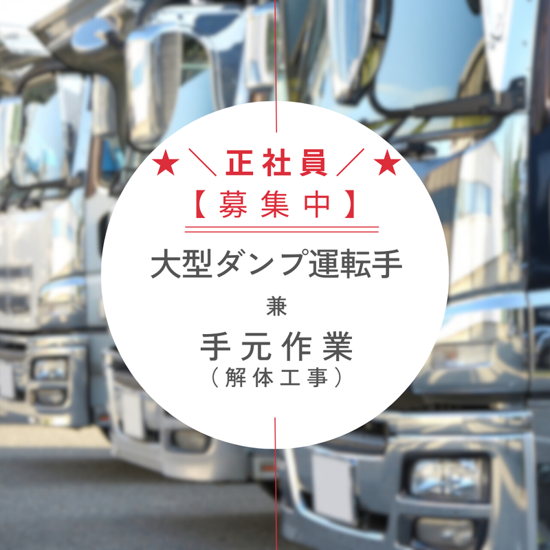 仕事内容 ─┘─┘─┘─┘─┘─┘─┘─┘─┘ ▼働きやすい理由&魅力▼ ✅通年雇用で冬も仕事が途切れず、出稼ぎ不要! ✅月給28万円~の高水準!頑張りは昇給・賞与で還元! ✅年末年始・GW・お盆の長期休暇あり(最長11日実績)! ✅希望休も相談OK!プライベートも大切にできます! ✅大型免許があれば解体業界の経験は不問です! ─┘─┘─┘─┘─┘─┘─┘─┘─┘ ≪業務内容≫ 札幌市内および近郊の解体現場で、 大型ダンプを運転し、産廃処理資材などを運搬するお仕事です。 安全かつ効率的な作業のため、 運搬時以外には積み込みなどの手元作業もお願いします。 ↓↓ ▼ ↓↓ 具体的なお仕事 ↓↓ ▼ ・大型ダンプで札幌市内・近郊の各解体現場へ移動 ・解体で出た資材の積み込み(手元作業のサポート) ・指定された産廃処理場への資材運搬 ・1日の業務終了後、ダンプの簡単な清掃や安全点検 ・翌日のスケジュールや運搬ルートの確認 >>>経験ゼロでもこれで安心 1|まずは先輩のダンプに同乗し、仕事の流れや現場のルール、運搬ルートなどを覚えることから始めます。 2|現場では、いきなり難しい作業は任せません。簡単な手元作業の補助など、できることから慣れていきましょう。 3|困ったことがあれば、すぐに周りの先輩に聞ける環境です。30代から50代の気さくなスタッフがしっかりサポートします。 4|業務に必要な資格が出てきた場合も「資格取得支援制度」があるので、費用面の心配なくスキルアップを目指せます。 ⇒未経験からでも、着実にプロのドライバーへと成長できる環境が整っています! 【この環境で働く魅力など】 01.│「冬も仕事安定!通年雇用で収入も安心」 →季節によって仕事量が変動することなく、一年を通して安定した業務量があります。 そのため出稼ぎに行く必要もありません。 月給28万円以上に加え、賞与や昇給で頑張りをしっかり評価するので、安定した収入を得られます。 02.│「しっかり休める!プライベートも充実」 →日曜・祝日の定休に加え、 GW・お盆・年末年始には長期休暇も取得可能です(最長11日の実績あり)。 希望休も事前に相談しやすいため、 家族との時間や自分の趣味の時間もしっかり確保でき、 メリハリをつけて働けます。 03.│「スキルアップを全力で応援します!」 →大型免許さえあれば、解体業界での経験は問いません。 異業種から転職してきた先輩も活躍中です。 また、業務に関連する資格の取得支援制度もご用意。 働きながら自身のスキルと価値を高めていける環境です。 <✨他にはない、ここで働く魅力✨> →30代40代50代の6名が活躍する、少数精鋭の職場です。 だからこそスタッフ同士の距離が近く、みんな仲が良いのが自慢。 新人さんもすぐに馴染める、 和気あいあいとした雰囲気の中で安心して仕事に取り組めます。 \スタッフにインタビューしてみました!/  ̄ ̄ ̄v ̄ ̄ ̄ ̄ ̄ ̄ ̄ ̄ ̄ ̄ ̄ ̄ ̄ ̄ ■入社のきっかけ… 前職もドライバーでしたが、冬場の仕事が不安定なのが悩みでした。 ここは通年雇用で一年中仕事が安定していること、 そして月給や賞与といった待遇面がしっかりしていることに魅力を感じて転職を決意しました。 札幌市内で腰を据えて働けるのが嬉しいです。 ■仕事のやりがいについて… 解体現場という、街の景色が変わっていく最前線で働けることに面白さを感じます。 自分のダンプでの運搬が、 現場作業をスムーズに進めるための重要な一部になっていると実感できた時にやりがいを感じますね。 会社の雰囲気も良く、長く続けたいと思える職場です。