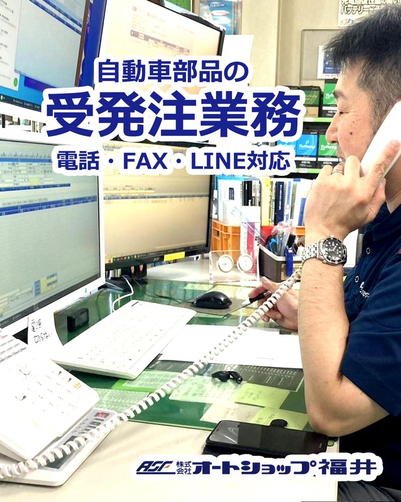 仕事内容 ―――◇◆ アピールポイント ◆◇――― ★選べる働き方★ 2種の雇用区分からご自身のライフスタイルや状況に合わせた働き方が可能です。 年間休日120日 または 107日の2パターンを用意しています。 固定時間外手当の有無の違いはありますが、業務内容に違いはありません。 ■自動車の知識、経験を活かしたい人に最適★ ■創業56年の安定基盤 長く活躍できる◎ ■社用車タイヤ交換無料など嬉しい社割制度あり☆ ■整備士資格保有者の方、知識や経験を活かせます ―――――――――――――――――― 自動車整備工場からの専門的な注文に対し、独自の検索システムを駆使して部品の特定・発注を行う受発注事務およびルート配送業務です。 現場経験や知識を活かし、プロの視点で最適なパーツを提案する「パーツサポーター」として活躍していただきます。 ▼ 具体的なお仕事 ▼ ・整備工場からの電話やLINE等による注文受付(1人1日40〜60件程度) ・型式・車体番号を元に、専用システムやメーカーWEBでの正確な部品適合確認 ・希望納期や在庫状況に応じた代替品の提案、および仕入先への発注手配 ・社用車による固定ルートへの部品配送、および現場での追加注文対応 ・県内トップクラスの在庫数(約12,000点)の管理と入出荷データの共有 ・繁忙期の軽整備(タイヤ交換等) 本社(福井市文京)にて、自動車整備工場からの部品注文を電話やFAX等で受け付け、 仕入先へ発注・納期管理を行う事務ワークです。社内はオープンフロアで、 部署間の連携が取りやすい設計。 独自の部品検索システムや社内共有ネットワークを有し、 分からない事は気軽に聞ける環境です。 デュアルディスプレイを完備し、 長時間の入力作業も快適にこなせる環境を整えています。 自動車整備士資格を持ったスタッフも10名在籍し、自身の経験や知識を活かして整備工場様のサポートをしています。 ★営業 電話対応、受注・発注業務について  ̄ ̄ ̄ ̄ ̄ ̄ ̄ ̄ ̄ ̄ ̄ ̄ ̄ ̄ ̄ ̄ ̄ ̄ ・電話・FAX・LINEでの注文受付:1人1日あたり40~60件の部品注文を受領。 お客様は車検・事故修理を行う整備工場様が中心。 ・注文データ入力:専用自動車部品検索システムに 「型式」「車体番号」を登録し、欲しい商品を特定していきます。 ・部品適合確認:独自の部品検索システムおよびメーカーWEBシステムを用い、 型式・グレード別に最適部品を選定。品番が複数ある場合は、 希望納期と在庫状況を踏まえた代替品提案も実施。 ・仕入先発注手配:Web発注画面およびメール・LINE・FAXで発注。 ・発注後、各拠点に自社伝票を発伝し、集荷・配達情報を共有しています。 ★営業・エリア配達業務について  ̄ ̄ ̄ ̄ ̄ ̄ ̄ ̄ ̄ ̄ ̄ ̄ ̄ ̄ ̄ ̄ ̄ ̄ 自動車整備工場にルート配達しながら ・お客様からの追加注文の対応 ・事故車の必要な部品を現場で確認 ・新商品の提案 ・エンジンオイルのオイルタンクへの補充 などお客様をサポートしながら営業業務にあたっています。 ★軽整備について  ̄ ̄ ̄ ̄ ̄ ̄ ̄ ̄ ̄ ̄ ̄ ̄ ̄ ̄ ̄ ̄ ̄ ̄ タイヤ交換や組替・オイル交換が主な作業です。 繁忙期中心なので、通常時は受発注かルート営業配達を行います ★在庫管理  ̄ ̄ ̄ ̄ ̄ ̄ ̄ ̄ ̄ ̄ ̄ ̄ ̄ ̄ ̄ ̄ ̄ ̄ 県内トップクラスの販売実績で 合計12000点の拠点在庫を管理しています。 出荷実績を確認しながら 各拠点の在庫が適正になるよう在庫管理しています。 ★受発注業務のフロー例  ̄ ̄ ̄ ̄ ̄ ̄ ̄ ̄ ̄ ̄ ̄ ̄ ̄ ̄ ̄ ̄ ̄ ̄ 8:30~17:30 受発注業務 (電話・FAX・LINEの受注を6名~8名のスタッフで手分けして対応) お昼休憩 11:00~14:00 の間60分 お昼時間帯を中心に交代で休憩を取っています(社内休憩スペースにて) 当社について ================== 福井の地で創業56年目の 自動車部品卸売会社です。 福井県嶺北・奥越地域の4拠点から 地元の自動車整備工場や ガソリンスタンドなどへ 自動車部品をお届けし続けています。 パーツサポーターとして、 車検や事故で修理部品を必要としている 整備現場を支えるのが当社の仕事です。 自動車に関する品を全て取扱い、 独自の部品検索システムや 自社配送サービスは オールインワンストップで 欲しい商品が揃うと評価いただいています 病気や通院など 急な事情にも臨機応変に対応しています。 全員5日以上の有給休暇を取得しています。 (前年度の有給取得実績 5日~16日) ♢ 毎月500円分のギフトクーポンを配信(コンビニやスタバ等で使用可能) ♢ 地域の飲食店や映画館などで使える 優待付き福利厚生アプリ「福利UP」導入 ♢ 家族も利用可能な、全国10万店舗以上で使える優待制度 ♢ 家族も利用できる、外食・映画・カフェ・レジャー等の割引・優待特典あり 詳しくは福利厚生欄をご確認ください オートショップ福井のインスタに 会社案内や業務風景など載せています♪ ぜひご覧ください★