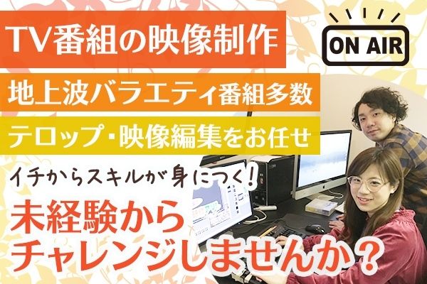 タイトル 【未経験から始める】女子会トーク番組のテロップ制作 職種 テロップ制作・クリエイター 【未経験から始める】女子会トーク番組のテロップ制作 雇用形態 派遣社員 仕事内容 ▼テレビ番組制作アシスタントディレクター ......・.......・.......・.......・ \有名アイドル・芸人・アーティストと会える/ テレビ番組の制作アシスタントディレクター募集 ......・.......・.......・.......・ ディレクターの指示のもと、番組の企画や制作に携わるお仕事です! 企画からオンエアに向けた一連の準備と収録まで幅広く携わっていただきます。 <具体的には> ●テレビ局やロケ現場での撮影・映像編集サポート ●企画のためのリサーチや資料作成、台本等の手直しやコピー ●出演者やスタッフの弁当発注、小道具の買出し ●電話やメールでの撮影交渉(外録はその場の交渉もあり) ●ロケハン(ロケ場所の下見) ●使用許可申請 ●スタジオ収録・ロケ準備、本番中のディレクターサポート ●編集フォロー、編集時の準備 など <入社後の流れ> 入社してスグは、先輩スタッフと一緒に現場に入り、基本的な仕事の流れを覚えることからスタート◎ 徐々にさまざまな業務をお任せしていきますので安心してください! 《毎日がワクワクでいっぱい♪》 テレビ業界=ハードワークな昔のイメージから一変! 今では、休日&休憩がきちんと取れる働きやすい環境です。 一番の魅力は、有名芸能人やアイドルとの出会いがあること! 普段見ていた人気番組に携わる毎日に、ワクワクが止まりません♪ 《お仕事のここが楽しい?》 チーム一丸となって、一つのものを作り上げていく楽しみは格別! ディレクターやチームの仲間、テレビ局、制作スタッフ、ロケ先の担当者様、打合せ場所となる喫茶店、ロケ弁当業者の方々など、番組づくりに関わるさまざまな人たちと協力しながら、一緒に番組を作りましょう! 《未経験からチャレンジしやすい業界です♪》 先輩たちも未経験から始めた人ばかりなので、経験などは一切関係ありません! たくさんの人と関わる仕事なので、人と話すことが苦手でなければ大丈夫◎ 只今、20代メンバーが多数活躍しています! 《イイなと思ったらキャリアアップもできる?》 ADとして経験を積んで、3年でディレクターになった人もいます! また、編集アシスタントやバックオフィス系などにキャリアチェンジも可能◎ 得意なことを磨きたいなど、他の職種にもチャレンジできる環境です! 募集の背景 世の中ではテレビ離れが進んでいると言われていますが、実は「見てないけどテレビはつけている」という人は多いです。 なんとなくつけていた番組が面白くて見入ったという経験をしたことってありますよね。 テロップ制作は、番組をより分かりやすく、より面白くするために欠かせない大事な仕事です。 未経験から始められるよう研修制度をご用意していますので、「やってみたい」という方を歓迎します! ※2026年3月卒業予定の新卒採用エントリーは弊社HPの『新卒採用』より内容をご確認お願いいたします。