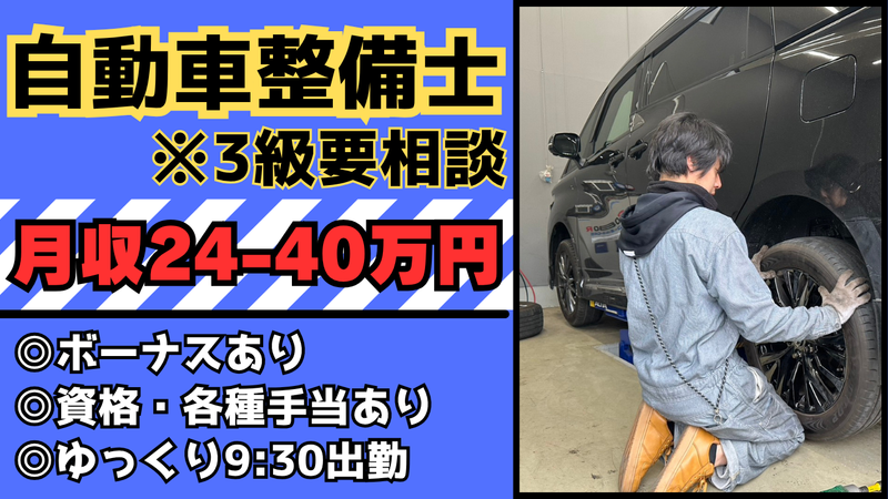 応募資格 自動車整備士2級以上をお持ちの方 ※3級の方もお気軽にご相談ください。 【前職はどんなお仕事をしていた人がいる?】 ・飲食店スタッフ ・フードデリバリー ・メーカーでの営業 ・IT系のプログラマーやシステムエンジニア(SE) ・物流倉庫での配送や倉庫管理 ※ハローワークでお仕事探し中の方も歓迎 【当社で求める基礎スキル】 ・高いコミュニケーション力は求めません。 普通に挨拶ができれば問題なし。 ・積極性や自発的も最初は求めません。 仕事を覚えて、後輩ができるころにはしっかりと積極的にお仕事のアドバイスなどをしてやって下さい。 【マンツーマンでの丁寧な教育に自信あり】 未経験の方や不安な方には自信がつくまで丁寧にしっかりと教えます。 みんな未経験から入社した方ばかりです。わからないことは聞きやすいですよ。 高卒以上