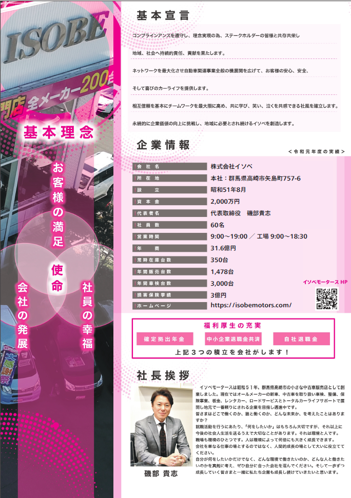 お仕事内容 \新しい工場でメカニック見習い/ 会社もスタッフも日々成長中! 昨年オープンしたばかりの綺麗な工場で 正社員の作業員を増員募集します 具体的には: ■自動車整備や修理の補助 ■整備の受付や説明などの接客 ■アフターパーツの取り付けなど 全メーカーの車両に対応しています 【将来は見習いから整備士へ】 様々な車に触れられるお仕事です 整備士や検査員の資格取得支援があり 知識ゼロからメカニックを目指せます! 【勤務地】 イソベカーステーション((株)イソベ イソベモータース) ■群馬県高崎市矢島町480-5 ■高崎市西島交番近く ■高崎駅から車10分 ※車通勤OK、バイク通勤OK(無料駐車場あり) 受動喫煙対策:店内全面禁煙・野外屋根付き指定喫煙所あり