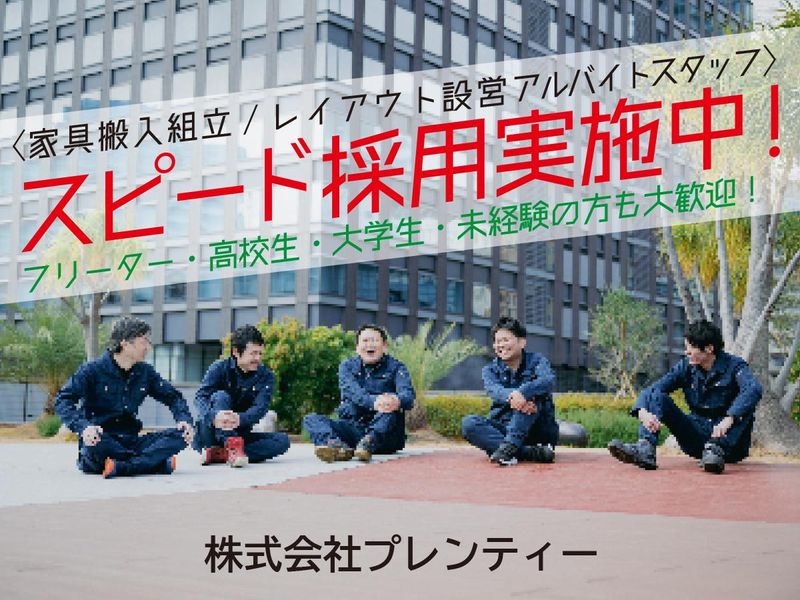 仕事内容 オフィス用家具の搬入・組立 レイアウト設営業務をお任せします! ■荷物を台車に乗せて移動 ■イスや机など簡単な家具の組立て作業 など 常に数名のチームで作業を行うので、 未経験の方でも安心して働ける環境です♪ 「単発」「短期」「長期」 「即日」「日勤」「オープニング」など、 様々な条件で案件多数あり! 自分に合った働き方が出来ます!