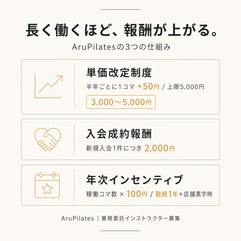 仕事内容: 【まず知ってほしい条件】 ・女性専用・完全パーソナルのマシンピラティススタジオ ・1コマ75分 / 1コマ3,000〜5,000円 ・池尻大橋駅 徒歩3分 ・業務委託 / シフト自由 / 週20コマ以上歓迎 ・ピラティス資格保有者対象(資格取得直後の方も相談可) ・慶應義塾大学病院の現役産婦人科医監修プログラム ・スタジオの雰囲気やプログラム詳細:https://aru-pilates.jp ・入会成約報酬2,000円、継続6ヶ月ごとの単価UP、年次インセンティブあり 【収入イメージ】 ・週10コマ稼働:月12万円前後〜 ・週20コマ稼働:月24万円前後〜 ・経験、継続期間、入会成約数により上振れがあります ※予約状況により実際の報酬は変動します。会社都合でレッスンを中止した場合は、1コマあたりの基本報酬を補償します。 【選考は条件確認から】 まずはオンラインで30分程度、条件確認からでも可能です。 応募時点で履歴書・職務経歴書が完璧でなくても問題ありません。 【AruPilatesからのメッセージ】 あなたの「1年の経験」は、もっと評価されていい。 レッスンの準備、声かけ、反省、学び直し。目に見えにくい努力ほど、ちゃんと見ていきます。AruPilatesは、一人ひとりが安心して挑戦できるように、迷った時は立ち止まって相談できて、振り返って次に活かせる環境をつくります。「できたこと」も「課題」も、曖昧にしません。 ただ、立ち上げ期だからこそ、楽な日ばかりではありません。やることが増える時期もあるし、思うようにいかない日もある。それでも一歩ずつ前に進める人を、近くで支えたいと思っています。 あなたの経験を、ここで"次の自信"に変えませんか。 【スタジオについて】 AruPilates(アル ピラティス)は、慶應義塾大学病院の現役産婦人科医が監修する、女性専用パーソナルマシンピラティススタジオです。 ・完全パーソナル(1対1)のマシンピラティス指導 ・産婦人科医監修による独自プログラム(骨盤底筋、姿勢改善、自律神経、産前産後ケア) ・五感アプローチの空間設計 ・客単価:都度払い¥12,000/会員¥8,900〜¥10,200 【業務内容】 業務委託契約に基づき、以下の業務をご自身の裁量で遂行いただきます。 ■ レッスン業務 ・完全パーソナル形式でのマシンピラティスレッスン(1コマ75分) ・レッスン前後のマシン・スタジオ清掃、備品点検 ■ 体験者対応業務 ・新規体験者へのカウンセリング・レッスン提供 ・入会案内・契約手続きのサポート ■ 店舗運営補助業務 ・開店・閉店作業(鍵の開閉、空調・照明管理 等) ・予約・問い合わせへの一次対応 ■ 情報連携 ・店長または本部との定期ミーティング(運営方針・顧客情報の共有、意見交換) 【雇用形態】 業務委託契約 【契約期間】 まずは1ヶ月間の契約からスタートし、お互いにフィットすることを確認したうえで、以降は6ヶ月ごとの契約更新となります(期間満了の30日前までに双方から申し出がない場合は自動更新)。 【その他】 ・初回研修は無償で実施します ・賠償責任保険(対人・対物)への加入が必要です ・保有資格の有効期限管理・更新手続きは受託者にて実施いただきます ・契約内容の詳細(秘密保持、競業避止、知的財産等)は契約書にて説明します 【選考プロセス】 1. Indeed経由でご応募 2. 書類選考 3. 一次面接(オンライン or 対面) 4. 体験レッスン・実技確認 5. 契約締結・稼働開始