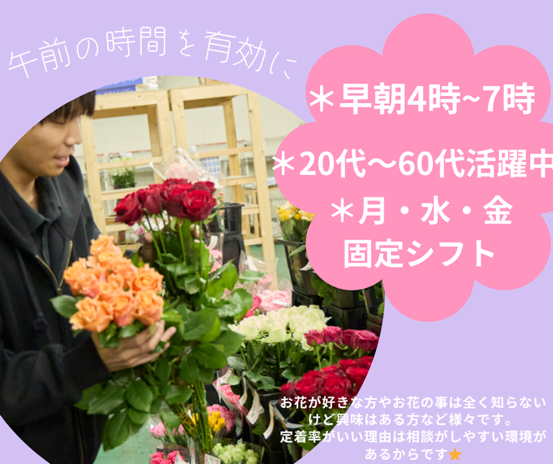 仕事内容 ✧✦✧✦✧✦✧✦✧✦✧✦✧✦✧✦✧✦✧✦ こんな方にぴったり! ●早朝の短時間で、確実に収入を得たいWワーカー・シニアの方 ●一日の始まりに効率よく働きたい方 ●授業前の時間を活用したい学生さん ●Wワークや自営業と両立したい方(特に早朝勤務を希望される方) ●コツコツとした作業が好きな方 ✧✦✧✦✧✦✧✦✧✦✧✦✧✦✧✦✧✦✧✦ ・勤務曜日:月曜日・水曜日・金曜日の固定(週3日) ・勤務時間 4:00~7:00(実働3時間) ・シフトサイクル 1ヶ月毎のシフト制 【超早朝勤務のメリット】 午前7時には業務終了です! 日中は別の仕事や学校、プライベートの活動に集中でき、時間を最も有効活用できる働き方です。 短時間で集中して働きたい方に最適です。 【具体的に‥・】 3.4名ほどで作業を行います。 ◆ラベル発行・入出荷検品(メイン業務) 届いたお花に間違いがないかを確認し、ラベルを発行して貼り付ける作業。 難しい専門知識や複雑な手順は一切不要! はじめはマンツーマンで研修があるので安心。 ◆品出し・店頭販売 お花を店頭に並べる陳列作業。 店頭販売(レジ)をお願いすることもありますが、お客様は顔なじみのBtoBのお客様がメイン(多くて30組程度)のため、安心です。 【ポイント】 作業がメインのため、接客が苦手な方でも大丈夫です。 入社後はマンツーマンで丁寧に研修を行いますので、ご安心ください! ―・―・―・―・―・―・―・―・―・―・―・―・ 【スタッフ構成と雰囲気】 幅広い世代が活躍: シニア、学生、フリーター、自営業とのWワーカーさんまで、多様なスタッフが活躍しています! 【お花に囲まれた特典と交流】 癒やしの空間: 季節ごとのお花に囲まれ、日々の疲れやストレスをリフレッシュできます。 【社販あり!】 お花は社員割引価格で購入可能!ご自宅に飾ったり、大切な方へのプレゼントに安く買えると好評です。