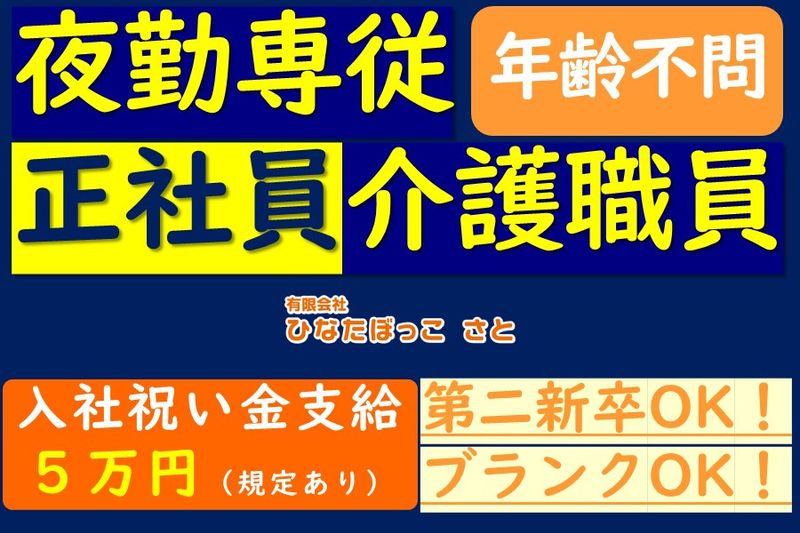 【アピールポイント】 夜勤専従の常勤介護職員募集! ◎入社祝い金5万円支給(規定あり) ●完全週休2日制! ●丁寧な研修・フォローあり! ●退職金制度あり! ●有料老人ホーム未経験の方、大歓迎! ●ブランクある方、大歓迎!