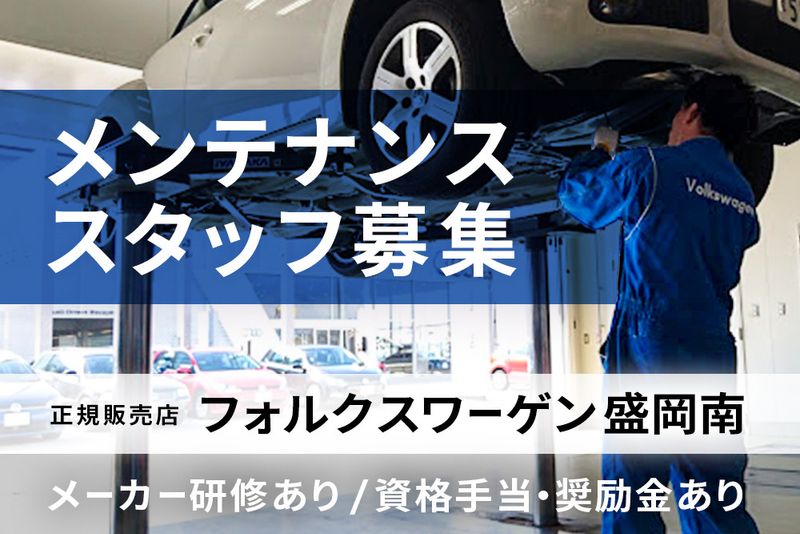 【仕事内容】 フォルクスワーゲン正規ディーラーとして、車両の整備・修理を行っていただきます。 【メンテナンススタッフ】 ショールームに併設された工場で、フォルクスワーゲン車の整備、修理を行います。 ●車検・法定点検 ●修理・メンテナンスなど フォルクスワーゲン正規販売店【岩手県盛岡市】 ★メンテナンススタッフ募集★ サービス達成奨励金制度あり/賞与2回(昨年度2.8ヶ月)/昇給あり 業界未経験歓迎 ~研修制度があります~ UJIターン歓迎! 【当社について】 当社はフォルクスワーゲンの正規販売店です。 フォルクスワーゲン盛岡南のメンテナンススタッフとして、フォルクスワーゲン車の整備・修理を担当していただきます。 *入社後、メーカー研修への参加があります*作業着(つなぎ)の貸与があります*安全靴の貸与有ります*変更の範囲:会社の定める業務