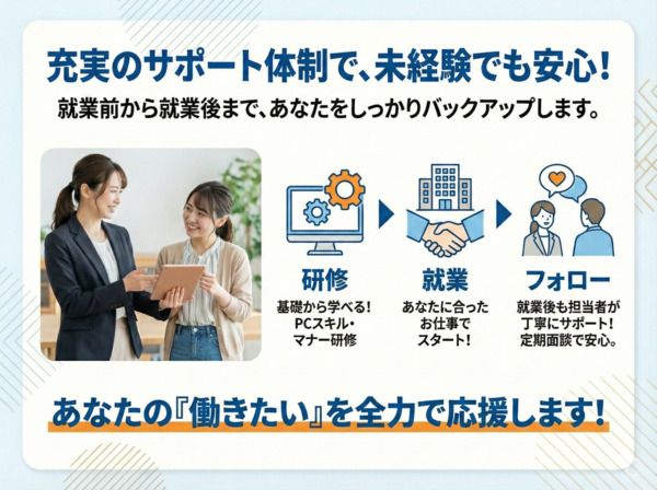 応募資格 学歴不問 経験不問 資格不問 性別不問 ★未経験者大歓迎!未経験から始めたスタッフが100%の職場です。 ★PCは簡単な入力ができる程度でOK(ソフトの知識不要) ★30代~50代多数活躍中☆ <歓迎します> ・丁寧な電話対応ができる方 ・主婦(夫)さん ・フリーターさん \以下の方も活躍中!/ ブランクのある方 Wワーク・副業希望の方 社会人デビューの方 長期で働きたい方 久しぶりの社会復帰の方 業界経験者