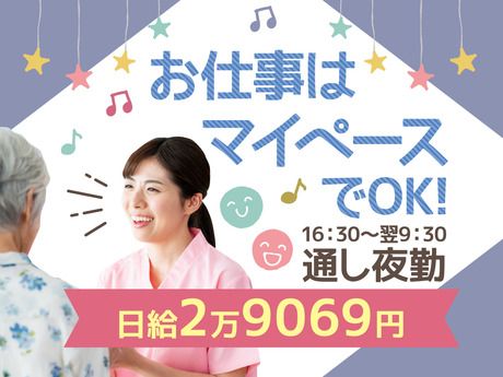仕事内容 【夜勤専従での看護助手】オン/オフのメリハリもばっちり!効率良く&無理せず稼げる月7回勤務◎ 福祉施設での看護助手業務をお願いします。 【具体的には…】 ◇環境整備 ◇備品の管理(備品の補充等) ◇配膳下膳 ◇利用者様の身の回りのお世話(食事介助・入浴介助・排泄介助等) ◇イベントの準備 ◇看護師さんのサポート …など ※研修中は病院での勤務となりますので、 検体搬送など他の業務もあります。 【1日のスケジュール例】 16:30~/出勤、お仕事開始! 18:00~/患者様に夕食やお茶を配る 20:00~/消灯前に患者様へおしぼりを配る ( 休憩 ) 22~4時/物品の補充や患者様の見守り 05:00~/患者様のお薬を取りに行く 06:00~/患者様に朝食やお茶を配る ~09:30/お仕事終了!残業せず退勤♪ \入社日の相談OK/ 「スグ働きたい」「来月から」 「暑さがもう少し落ち着いたら…」 など、あなたのタイミングでOK◎ 在職中の方もぜひご応募ください! \コスパ&タイパ重視(`・ω・´)/ □お給料の良い職場で働きたい □今より効率良く稼げる仕事に就きたい □とにかく高収入を稼ぎたい □プライベートもしっかり充実させたい そんな方には 【夜勤専従】がオススメです! 月7回勤務で当直や交替シフトなし◎ 自分時間もしっかり確保しながら稼げます♪ ■スタッフの声をご紹介! ★40代後半/経験者女性 前は家の近くの病院で、交替勤務で働いてました。 交替シフトが年々しんどくなってきたものの、 夜勤は稼げるのでなるべく入りたい… ならいっそ専従に切り替えちゃうか!と思って こちらの職場へ転職を決めました。 お給料は子供の教育資金や食費に充ててます。 上の子が高校生でとにかくお金がかかる… 日々のお昼代、塾代、参考書代に 大学入学費用のため、コツコツ貯金しています! あと、少し自分のお小遣いにしてます(笑) ■無資格・未経験からスタートOK 医療・介護・福祉の知識・資格・経験不問! 未経験から安定の業界で働けます◎ お仕事にブランクがある方もお気軽にご応募ください! 当社で活躍してくださっている方の半数以上が未経験スタート。 教育制度も整っているので、少しずつステップアップしていけますよ◎ 働きながらの資格取得も応援します! 手に職をつけたい方、安定業界でお仕事始めてみませんか♪ \長期安定で働けます/ 景気に左右されない福祉業界でのお仕事なので、 将来的にも安定できますよ◎ 年を重ねても長く活躍していただけますし、 40代・50代から未経験で始めた方も多いんです♪ <AI_N>