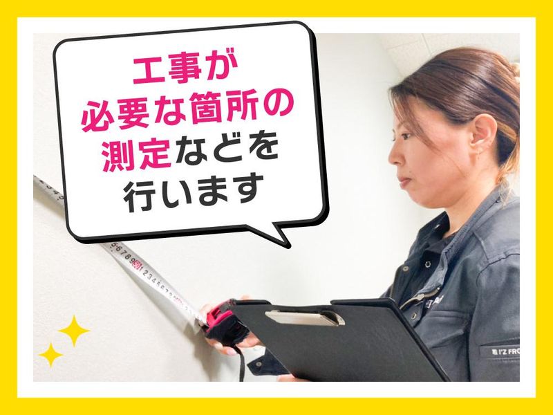 仕事内容 ************* 「未経験スタートだけど、 給与が下がるのはちょっと…」 そんな方も必見のお仕事☆ 賃貸マンションの退去立会 ************* 大手不動産会社からご依頼を受け、 賃貸マンション退去時の立会、 修繕などのリペア、 設備管理を行っている当社。 丁寧且つ迅速な対応で培ってきた 確かな信頼により、依頼の急増と 事業拡大に向け、増員を決定! 今回は入居者さんが退去される際、 壁紙が剥がれていないか、 破損してる箇所はないかなどの チェックをしていただく立会スタッフを募集! 少人数の会社なので管理職を目指したい方にもオススメです! *** 【具体的なお仕事内容】 ◆賃貸マンションなどの退居時の立会い(1日2~3件) ◆傷や汚れをチェックして修繕費の見積書を作成 ◆施工会社に工事を手配し、工事に立会うこともあります ※社用車(軽自動車)で現場に向かいます ※チェック+見積もりの所要時間は早くて5~10分、 広いお部屋であれば1時間ほどです ★将来は管理職や新人さんの教育もお任せ! 管理職や教育を担うポジションを目指していただけるとありがたいです。 *** 【随時昇給のチャンスがあります】 社長は社員に「頑張っても評価されない…」 という悲しさを絶対に感じさせないと決めています。 仕事を一生懸命に覚えたり、 会社を育てるためにアイデアを 出してくれたりする姿勢はしっかり評価。 回数やタイミングは定めず、 頑張りが見えたら即昇給していきます。 試用期間後に「いきなり月給5万円UP」もありえますよ! *** 【コミュニケーション力を活かせる環境です】 社内外問わず様々な人たちと関わりながら進める仕事なので、 チームワークや連携を大切にできる方を求めています。 まだまだ新しい会社なので、 業務マニュアルや教育体制もできれば一緒に作っていきたいです。 マネジメントを学びたい方や、 スキルを広げたい方、 アイデアを活かしたい方はきっと楽しめる環境だと思います。 *** 【当社はこんな会社です】 \創業5年ながら業績好調/ 物件の原状回復工事は、賃貸物件が ある限り必ず求められる事業。 しかも大手不動産会社から 業務をお任せいただいているため 依頼数は安定しています。 \事業内容はさらに増える予定/ 社長は今、建設業許可を取るため勉強中! 工費の大きな案件もお受けできる会社に成長しようとしています。 \選ばれる理由があります/ スピーディーな対応をするために 各部屋のエアコンの製造年を あらかじめ把握しておくなど、 お任せ頂いた物件を徹底して 知る姿勢が評価され 「他社より費用が高くても頼みたい」 と言われる会社です。 【参考URL】 https://www.remend.jp/ 是非当社のサイトをご覧ください!