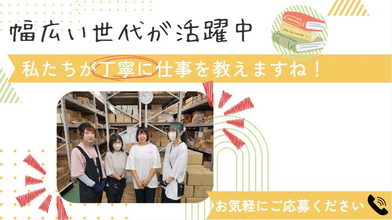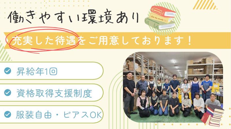 仕事内容 ❖本のピッキングをお願いします❖ 出荷指示書(ロケーション)の指示により本をピッキングするお仕事です コツコツ作業や細かい作業がお得意な方にオススメ♪ ピッキング・検品・梱包・構内作業・軽作業 経験のある方、歓迎⤴ 未経験者の方も活躍中です!! ✿誰にでもできる作業です✿ 土日休み&1日4h~OKなので私生活と両立♪公私共に充実させたい方は是非ご応募を♪ ✿業務拡大につき大募集!!✿ 未経験スタートOK!充実の待遇◎働き方が選べて働き易さ◎仕事と家庭の両立もしっかり出来る✿ 有給休暇有(有給消化率95%以上)昇給年1回、社会保険完備、服装・ピアス自由etc…働き易さ抜群の職場です! シフト制orフルタイムで働き方を選べるので無理なく働く事が出来ます(^^♪幅広い年代が活躍中の職場です♪