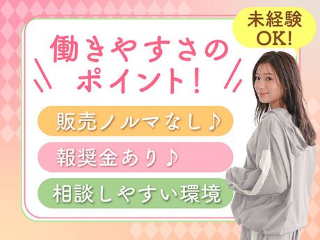 仕事内容 *\店舗での接客・販売のお仕事です!/* *.。.*゚*.。.*゚*.。.*゚*.。.*゚*.。.*゚*. かわいくてお手頃なのに機能的。 身に付けるだけで気分が上がる、 綺麗なボディラインを叶える、 ランジェリーブランド”aimerfeel” 女性を内側からキレイに、Happyに、 そんなお手伝いを一緒にしませんか? <仕事内容> ・接客 ・レジ対応(※遅番はレジ締めあり) ・検品作業 ・品出し ・ディスプレイ ・商品管理・発注 など ご来店されたお客様へ、 フィッティングのご案内や レジ対応などを中心にお任せします。 *.。.*゚*.。.*゚*.。.*゚*.。.*゚*.。.*゚*. *\ 1日の流れを紹介! /* 《出勤・開店準備》 お客様が気持ち良くお買い物できるよう 清掃など開店準備をします。 ▼ 《開店》 接客やレジ、お客様へのご提案、 フィッティングのご案内 など ▼ 《休憩》 ▼ 《休憩後》 接客やレジを中心に店舗業務をお任せ! 合間に品出しなどもお願いします! ▼ 《閉店作業》 翌日の営業に向けて、 レジ締めなどを行います。 ▼ 《退勤》 今日も1日お疲れ様でした★ ※早番/遅番などシフトによって開店準備や 閉店作業など業務内容が異なります。 *.。.*゚*.。.*゚*.。.*゚*.。.*゚*.。.*゚*. *\バイトビギナーも安心!/* 「接客販売は初めて…」そんな方も大丈夫◎ まずはカンタンなお仕事からスタート! 近くに先輩スタッフがいるから、 分からないことはすぐ聞けちゃいます♪ お客様は同年代が多いから、 自然と会話が盛り上がることも! 売上ノルマも一切ないので、 アパレル初挑戦の方にもぴったりです◎ *.。.*゚*.。.*゚*.。.*゚*.。.*゚*.。.*゚*. *\お客様のお悩みを解決!/* 体型や骨格に合わせて、 ぴったりのブラは人それぞれ。 「どれが合うかな?」というお悩みに寄り添って、 お客様に最適な一枚をご提案します♪ 働きながら、下着選びのコツなど “キレイ”に近づく知識も自然と身につきますよ◎ *.。.*゚*.。.*゚*.。.*゚*.。.*゚*.。.*゚*. *\"オシゴト"の両立を応援!/* 「昨日は推しと同じ空気吸ってきました~!」 「平日のミーグリも余裕で行けました!」 「次のイベントのために "推し活貯金"頑張ってるんです!」など 推し活が趣味のスタッフが多数活躍中! 平日にお休みが取れるから、 イベントや舞台などにも 余裕で参加できちゃいます♪ "推し事"も"お仕事"も、どっちも大切にしたい そんなあなたにぴったりの環境です◎ *.。.*゚*.。.*゚*.。.*゚*.。.*゚*.。.*゚*.