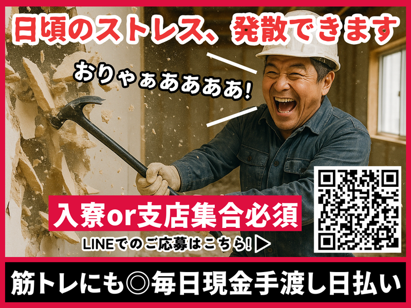 求めている人材 <必須> ✅建設作業の経験がある方 ◆学歴不問! 中卒、高卒…何でもOK! ◆転職回数なども不問! 過去のことは関係ナシ ✅運転免許保持者大歓迎 運転1回1000円支給! <こんな方も歓迎> ■友人宅にずっと居候しているけど、 そろそろ住み込みの仕事探さなきゃ… ■今すぐ働ける場所ないかなぁ… ■明日の寝床、食事どうしようかなぁ… ■とりあえず明日生きていくための お金がほしいなぁ…