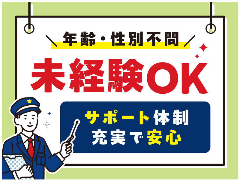 求めている人材 ・18歳以上の方(例外事由2号) ※労働基準法等の規定により年齢制限が設けられているため ・1月実施の研修に参加可能な方 ※2026年1月24日(土)〜31日(土)までの間で、3日程度研修を予定しております。その他の期間で研修をご希望の方はご相談ください。 <こんな方にオススメ> ・定年後の再就職をお考えの方 ・短期集中で働きたい方 ・安定収入をお求めの方 ・友人と一緒にお仕事を始めたい方 ・社会とつながっていたい方 など 年齢の条件と理由:あり(18歳以上(警備業法による例外事由2号))