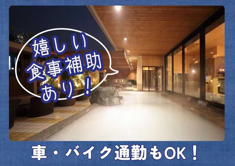 職場環境 館内は清潔感があり落ち着いた雰囲気♪レストラン・清掃ともに複数名体制で、困った時はすぐ相談できます。未経験スタートの方も多く、安心して長く働ける環境です。勤務後は無料入浴★ 喫煙所:喫煙所あり(屋外)