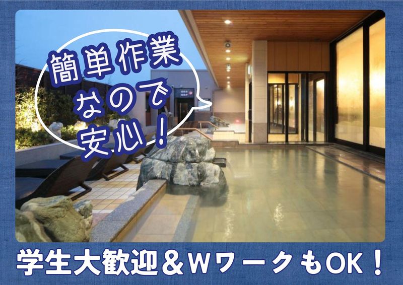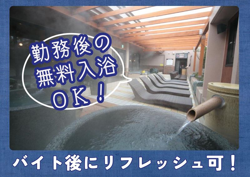 仕事内容 ✨授業終わりの夕方バイトにピッタリ!✨ ✨週3日~、1日4h~シフト相談OK✨ ✨配膳ロボット&タッチパネル導入✨ ✨未経験でも始めやすい環境です✨ ━━━━━━━━━━━━━━━━━ 学校終わりの17時~勤務OK! 「授業後に少し働きたい」 「休日バイトを探している」 そんな学生さんにぴったりの スパ施設アルバイトです✨ お仕事終わりには 温泉&岩盤浴を無料で利用OK! バイトしながらリフレッシュできます♨ ━━━━━━━━━━━━━━━━━ ⭐お仕事内容⭐ スパリゾートの館内業務をお任せします! ⏩レストランホール・キッチン業務 ・ホール内の清掃 ・テーブル片付け ・ドリンク作成 ・簡単なキッチン補助 ⇒注文はタッチパネル式♪ ⇒料理は配膳ロボットが運びます◎ ⇒接客が初めての方も安心です! ⏩お風呂場業務 ・アメニティ補充 ・脱衣所清掃 ・マット交換 ・備品チェック ⇒難しい作業はありません! ⇒チームで分担して行います☆ 先輩スタッフが丁寧に教えるので バイトデビューの方も安心です! ❇。・♦・。❇。・♦・。❇。・♦・。❇。・♦・。❇。 \自分に合ったポジションで活躍できます!/ ⏩接客好き ⇒ レストランのホール ⏩もくもく作業好き ⇒ レストランのキッチン・お風呂場 ❇。・♦・。❇。・♦・。❇。・♦・。❇。・♦・。❇。 \学生さん&Wワークに嬉しいポイント/ ✅ 17時~授業後バイトOK ✅ 週3日~シフト相談OK ✅ テスト期間はシフト調整可能 ✅ 初バイト・未経験歓迎 ✅ 友達同士の応募もOK ✅ 勤務後は温泉&岩盤浴無料♨ ❇。・♦・。❇。・♦・。❇。・♦・。❇。・♦・。❇。 未経験スタートの方も多数在籍しています♪ 動きのある仕事なので 時間が過ぎるのもあっという間。 丁寧な研修があるので安心です! まずはお気軽にご応募ください★