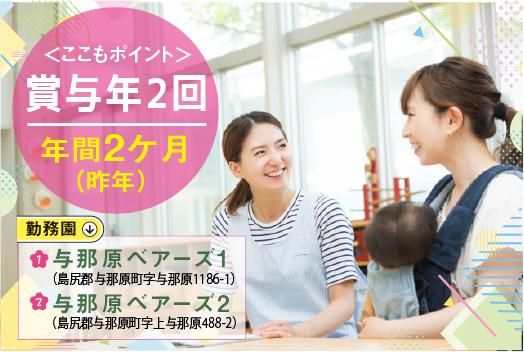 仕事内容 \当法人公式▶保育士採用/ 認可保育園の保育士▶正職員 こども主体の温かい保育を実現! ◆沖縄の子ども達の未来を育む 保育士さんを手厚い待遇で応援♪ ☆賞与年2回(昨年2ケ月/年間) ☆完全週休2日(年間休日120日) ☆産休・育休取得率99% ☆残業殆どナシ/月平均5h位♪ (手当/1分単位・サ残一切なし) ☆☆☆☆☆☆☆☆☆☆☆☆☆☆☆☆☆ ★就職準備金▶10万円支給! 当法人に直接ご連絡頂き入職の保育士 ☆☆☆☆☆☆☆☆☆☆☆☆☆☆☆☆☆ 【必要な資格】 ・保育士資格 ・幼稚園教諭免許も応相談♪ ☆今春新卒・第二新卒大歓迎♪ ☆転職・ブランク幅広く大歓迎♪ (現在転職をお考えの方も歓迎) ◆20代・30代中心に40代・50代! 保育士活躍中(男女/産休保育士含) 【勤務園の詳細】 ■与那原ベアーズ1 沖縄県島尻郡与那原町与那原1186-1 交通/東陽バス【37. 那覇新開線】 「第二与那原」停下車歩4分 ★マイカー通勤OK(駐車場完備) ■与那原ベアーズ2 沖縄県島尻郡与那原町字上与那原488-2 交通/東陽バス【37. 那覇新開線】 「大里入口」停下車歩5分 ★マイカー通勤OK(駐車場完備) ♥私たち社会福祉法人 尚徳福祉会は、子育て家庭を応援すべく現在沖縄県内2園、鳥取県内3園・東京都23区内11園・神奈川県横浜市内4園及び川崎市内4園を運営しています。 【初年度月給】 月給/25万6349円~34万5575円 (年齢・経験等により優遇) ※処遇改善手当等一律含 【待遇・手当】 賞与年2回(昨年度2ケ月/年間) 家族手当(家族構成による) 時間外手当 ▶1分単位で支給 (昨年度/月平均5h程度) 【初年モデル年収】 358万8886円~483万8050円 (月給+処遇改善手当+賞与年2回一律含) ※家族手当・時間外手当は含みません。 【勤務時間・曜日】 7:00~19:00内で実働8h・休憩1h ローテーション/シフト制 (基本/週5日・40h勤務) <基本シフトの一例> 7:00~16:00/実8h 8:00~17:00/実8h 9:00~18:00/実8h 10:00~19:00/実8h ◆月に1回~2回程度/早番・遅番シフト有 ◆残業殆どなし/月平均5h程度 (1分単位で手当支給)♪ 【休日・休暇】 完全週休2日制 (日曜+祝日or他週1日) 年末年始・慰霊の日・他 <ゆとりのある保育でこども達と笑顔いっぱい充実した日々を> 小児科医の理事長が病気のお子様を診察する中で病児保育をやった方が良いと考え、保育園を立ち上げたところから尚徳福祉会が始まりました。 現在は保育・介護施設の運営を中心に複数展開をしており「良い保育園を作りたい」という想いを基に運営をしています。 【 保育士のスキルアップ】 子ども達の「やりたいこと」を満足するまでやるうえで、全員が同じ方向を見て保育ができるよう、各園の保育士の特徴などに応じて参加できる法人内部研修や海外研修など多様な研修制度も整っているので、経験が少ない方でも働きながらスキルアップをすることができます。 【 残業管理を工夫しています 】 個人の働き易いスタイルに合わせて多めに採用を行っているので、書類作成や製作などがあっても、フリーの先生と協力することで残業を減らせるようにしています。 また自宅へ持ち帰り・サービス残業は一切禁止で、残業した場合は1分単位で支給しています。 【ここもポイント】 ☆園見学も応相談/要事前予約(状況により実施出来ない場合もあります) 実際に働く現場を見られることで、就職前と就職後のギャップを感じることもなく、安心して働き始めることができます。 ☆各種研修制度も充実 「責任が重そう」「事故が不安」「保護者との関係がむずかしそう」といったお仕事や人間関係に対する不安から、一歩が踏み出せない方やブランクのある方にも親切丁寧な研修を用意しているので安心して働き始められます。 いきなり一人で仕事を任せるといったこともありません。しっかりサポートするので心配ありません。 ◆社会福祉法人で働くメリット 社会福祉法人とは、社会福祉事業を行うことを目的として設立される民間企業で、地域福祉の充実・発展という 「公共性」、利潤を目的としない「非営利性」、事業の持続という「安定性」を特徴としています。 ◆具体的な特徴としては 地域に密着して運営しているので、異動があっても狭い範囲にとどまることがほとんどです。ご自身のプライベートにも大きな影響を与えません。 経営体系が利益追求型ではないので、業績による福利厚生の変動が少ない事も選ばれる理由の一つです。特に女性の場合は結婚・妊娠など、ライフプランの大きな転機があります。 企業によってはお仕事を辞めなければならないこともあり得ますが、社会福祉法人 尚徳福祉会は産休・育休取得率はほぼ100%!!職場復職を含め、貴方が積み上げたキャリアを諦めずに働き続けられる環境を常にご用意しています。 <法人概要> 尚徳福祉会は平成8年に設立認可を受け、病児保育施設「病児看護センターベアーズデイサービス」及び認可保育園「保育園ベアーズ」(現認定こども園よなごベアーズ)を開設しました。 現在は沖縄(2園)、東京23区内(11園)、神奈川県内(8園)、鳥取県内(10施設)で介護老人保健施設、保育園
