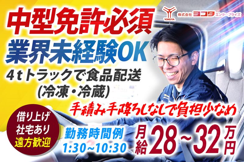 【アピールポイント】 【中型トラックドライバー大募集!】 チルド車での店舗配送をお願いします。 【配送エリア】例)神戸・大阪・京都・滋賀 ✅配送件数1日4~5件の日帰り運行 ✅高速道路利用/余裕のある配車 ✅安定給与!月収約28万円~32万円 ✅働きやすい環境で長く腰を据えて働ける