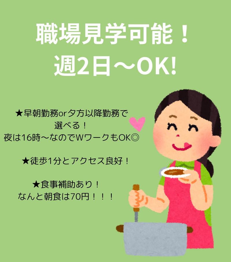 求めている人材 【必須】 ◇元気に挨拶できる方 【歓迎】 ◇調理補助や接客の経験がある方 ◇チームでの作業ができる方 \未経験大歓迎!/ ◆主婦・主夫歓迎 ◆大学生歓迎・フリーター歓迎 バイト・パートデビュー歓迎です♪ ◆長期歓迎 \こんな方にはピッタリです/ ・臨機応変に動ける方 ・チームでの作業が得意な方 ・朝だけ働きたい方 ・誰かの喜ぶ顔が見たい方 ・料理が好きな方 ・ルーティーンワークが得意な方 ●子育てとの両立が不安・・・ ●初めてのバイト(パート)で不安・・・ ●ブランクがあるけど大丈夫かな・・・ なんでもご相談ください! 仕事は、寮母さんが優しく教えて くれるので心配いりません♪ 性別の条件と理由:女性歓迎(ポジティブアクション)