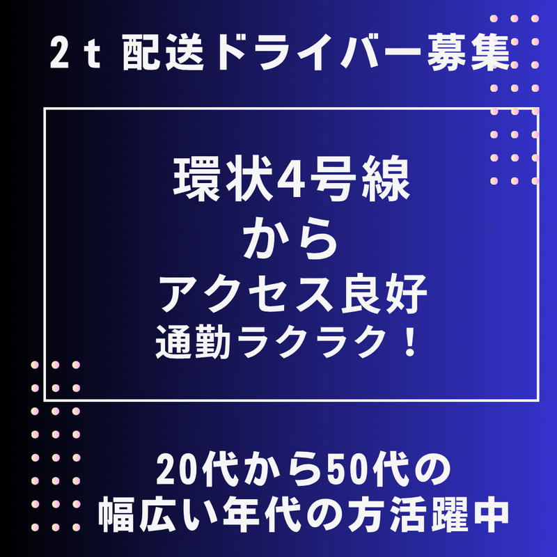 仕事内容 【面接・勤務開始日応相談】 <建築材料配送 2t 配送ドライバー募集> 建築材料の断熱材・システムキッチンなどを建設現場に配送していただきます。 重量物の持ち運びはありません。設置などの作業もありません。 配送件数は4件程度(配送先による)と少なめです。 ~1日の流れ~ ・6:30 車庫出発、積み地へ移動 ・7:30 商品積み込み、出発 ・10:00 現場に到着荷物を下ろして次へ出発 ・12:00 お昼休憩 ・13:30 2件目に到着、商品積み下ろし ・14:00 3件目へ出発 以降、神奈川から品川方面へ順に問屋さん等に配送。 ・15:30 車庫帰着、報告および次の日の配送確認後業務終了 ●創業30年の安定企業で長期安定して勤務可能 ●土日祝休みでプライベート時間も確保可能 ●中型免許がある方ならば未経験もOK ●AT限定免許可 ●月収32万円以上も可能 ●経験者の方は即戦力として月収アップも可能 ●日勤のみ、深夜勤務なし ●配送件数もすくなめ(4件程度) 【株式会社サンライズ】 株式会社サンライズは、1995年の創業以来、神奈川県をメインに配送している運送会社です。現在、30台※を超える車両を使用し、酒類や建材・生活雑貨・食品類など幅広く配達している会社です。 運送業界のイメージアップを目指し、「笑顔のあいさつ」をモットーにスタッフの笑顔が増えるよう労働環境を改善するよう取り組んでいます。私たちサンライズで一緒に働いてみませんか。ご応募お待ちしております。 ※保有車両:70台(4t/3t/2tL/2t/1.5t)(2024年7月現在)