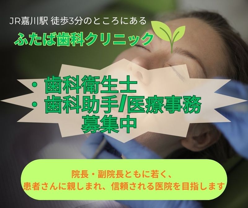 メッセージ 山口市のJR嘉川駅より徒歩3分にある 「ふたば歯科クリニック」で 働きませんか? ◆―――――――――――◆ ふたば歯科クリニックは 一般歯科/小児歯科/矯正歯科/口腔外科 訪問歯科/ホワイトニング/インプラント ●子どもから大人まで全世代の方を 対象としている歯科です! 月~金 9:30~21:00 (休憩時間 13:00~14:30) 土、日 9:30~18:00 (休憩時間 13:00~14:30) 院長・副院長ともに若く、背が高く 患者様に親しまれ、信頼される医院を 目指しています! ◆―――――――――――◆ 未経験の方も 経験がある方も 大歓迎! 完全週休2日制の年間休日120日!! プライベートの時間もしっかり取れます 助け合いながら、 働きやすい環境を作っていきましょう◎ ▽▽▽▽▽▽▽ ☆こちらのお仕事は、 企業様からお預かりし 転職エージェント『しごと計画学校』が ご紹介するお仕事です 『しごと計画学校』については 下記「その他欄」に記載しておりますので ご参考ください 経験がある方・ない方関係なくご応募お待ちしています!資格不問・知識不問・スキル不問 職業紹介事業(33-ユ-300208) 労働者派遣事業(派33-300443)