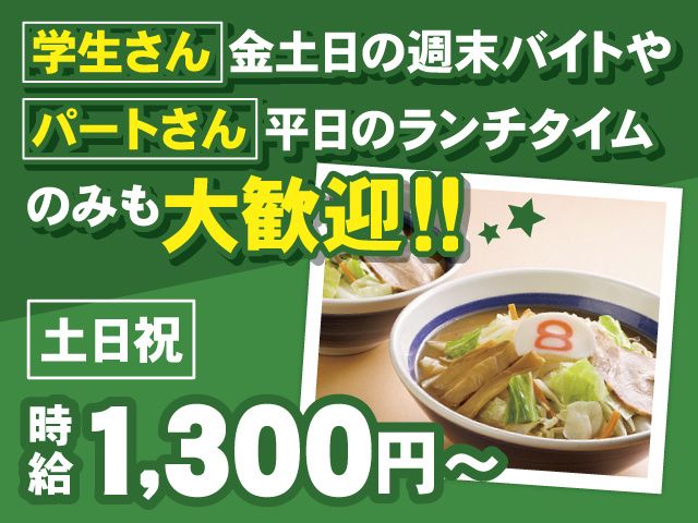 仕事内容 富山市安養寺にあります 「8番らーめん 安養寺店」で パート・アルバイトさんを募集中! 《オススメポイント》 ◎時給1,200円~/土日祝は1,300円! 22時以降は1,625円で更にUP! 都合のいい働き方や稼ぎたい金額に 合わせてシフトも調整できます。 ◎1日3時間~OK! 短時間勤務も可能なので 家事と両立したい主婦さんや スキマ時間に働きたい方にも! Wワーク/副業にも! ◎「平日だけ」「土日だけ」OK! 週末のみ勤務したい学生さんも 平日のみ働きたい主婦さんも! ◎メニュー半額の特典付き! 8番らーめんが好きな方大歓迎!! 【お仕事内容】 ホール業務をお願いします。 具体的には ・お客様のご案内 ・注文のお伺い ・お食事の提供 ・お食事後の片付け ・レジ業務 など 難しい業務はありません! 飲食業界が初めての方や アルバイトデビュー・パートデビューにも ご活用ください。 8番らーめんが好き! ラーメンや餃子、チャーハンが好き、 外食業界で働きたい方、 みなさん大歓迎です! まずはお気軽にお問い合わせください!
