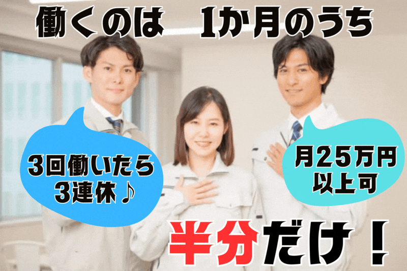 仕事内容 【 応募から2週間程度で内定可能! 】 《 ここがポイント! 》 ●月収25万円以上の高収入が可能 ●3日働いて3日休みの新しい働き方 ●機械操作や組付けが中心の軽作業 ●空調完備で年中快適な職場 ●男女問わず20代~40代が活躍中! 《 仕事内容 》 電気自動車やゲーム機、 携帯電話などに使われる 電源コイルやEVインバーターの 製造を行う工場でのお仕事です。 <ボタン操作が中心!マシンオペレーター> 電源コイルの加工工程にて、 マシンの操作を担当します。 部材を機械にセットし、 ボタンを押して加工スタート! 加工後は部品の取り出しや、 万が一機械が止まった際の 対応も行います。 1人で何台も操作する わけではなく、3人で5台を 見るチーム制です。 一度セットすれば約1時間は 自動運転なので、 落ち着いて取り組めます。 <プラモ感覚の組付け作業> EVインバーターの組立工程では、 5~10個の部品を取り付け、 最後にユニットを合体させて 検査・完成となります。 《 オンオフの切り替えがしやすい職場 》 「3日働いて3日休み」の サイクル勤務で、 毎週必ず3連休が取れます! 旅行に出かけたり、 家でゆっくり過ごしたり、 ライフスタイルに合わせて 休日を楽しめます。 働き方にメリハリをつけたい方に ぴったりの環境です。 《 落ち着いて働ける環境 》 職場は作業に集中しやすい 整った環境です。 安心して長く続けられる 働きやすさが魅力です。 《 未経験スタートの先輩も多数! 》 20代・30代・40代の 男性スタッフが中心となって活躍中。 未経験から始めた方も多く、 丁寧なサポート体制があるので 安心してスタートできます。