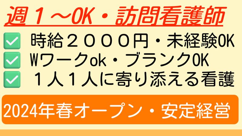 仕事の内容 時給2000円は、ほしい! 週1から勤務可能な所を探してる Wワークで働く予定 病棟だと、1人1人によりそえないのがな・・ 未経験だけど、訪問看護やってみたい! 「患者さんの退院してから」が気になる 経営者が現場をわかっていないので、ストレスフル オープン直後だからこそ、一緒に理想の訪看をつくりたい! ー もし、これらの中に1つでも該当することがあって、「どこか、良い職場ないかな?」って探しているなら、こちらの求人が、お役に立てるかもしれません。 ですので、ちょっとだけ、こちらの求人を、読んでいってもらえると嬉しいです。 ー はじめまして! 株式会社田中電機の田中と申します。 私は、製造業を15年経営している経営者です。 そして、訪問看護リハビリステーションも開設しています。 こう言うと、「なんで、電気屋さんが訪問看護なの??」って思われるかもしれませんね(汗) ですので、この点、ちょっと説明をさせてください! 実は、5年程前、家内の父が病気になり、診断結果は「癌」でした。 ステージ3で、直ぐに入院。 幸い、手術も成功し、退院するまで回復しました。 もっとも、その後も、入退院を繰り返すといった闘病生活となりました。 その時に、「訪問看護」と出会いました。 お恥ずかしながら、「訪問介護」は知っていたのですが、「訪問看護って何だ?」と知りませんでした。。 その時に、「訪問看護」に興味をもち、色々と調べる中で、「地域医療をすすめる国の方針」「病院の病床が足りない現状」「訪問看護が今後地域医療の担い手になっていくこと」等を知りました。 「訪問看護って大変な仕事だけど、これからの超高齢化社会では、在宅医療を支る大事な仕事だよなー」って強く感じました。 それと共に、 「医療関係者じゃなくても、訪問看護ステーションって開けるんだ!」 「自分の15年の経営経験を活かし、地域医療に貢献できるのではないか」 「我が家は、訪問看護にお世話になったからこそ、恩返しをしたいな」 こんな風に、思うようになりました。 これが、私が「訪問看護はじめたいな!」って思ったきっかけです。 こういった経験をしてきたからこそ、 「お世話になった訪問看護を支えたい!」 「少子高齢化で訪問看護が足りなくなってくる課題があるので、微力ながら経営経験を活かして、貢献したい!」 「どうせやるなら、働いてくれている看護師さん・療法士さんの待遇を改善し、ケアに集中できる環境を作りたい!」 といった思いを胸に、訪問看護ステーションを運営しています。 ー それでは、「なぜ、みる訪問看護なら、あなたの悩みを解決できるのか?」について、1つ1つ、ご説明させていただきます。 ちなみに、うちは、「仕事を探している方の人生の選択がかかわっているからこそ、しっかりと情報開示する」というスタンス。 当然、パート職においても、この考え方は、変わりません(一緒に働く仲間ですからね)。 ですので、こちらの求人も、だいぶ長文になっています。 なので、ひとまず、こちらの求人を「お気に入り登録」いただいて、じっくり、お読みいただければと思います! ー 【週1~OK】 「子育ての関係で、火曜しか働けない」 「月・水・木だけ働けるんだけどな・・」 みなさん、「それぞれの生活」があるからこそ、こういった悩み、ありますよね。 うちの場合は、あなたのライフスタイルに合わせて、「働きたい枠」で働いていただけます。 もちろん、「あなたの訪問を待っている利用者さん」がおりますので、「与えられた訪問枠」をしっかり働いていただく必要はありますが、「そもそも、どの時間、どの曜日の枠で働くのか」という、ご相談にのらせていただいてます! また、あらかじめ「いつもの水曜が、来月のこの日だけは、どうしても授業参観でダメだから、こっちと交換できますか?」といった相談にものれます。 つまり、「突然の休みは同僚や利用者さんが困ってしまうけど、あらかじめ段取りして、休んだり調整したりするのは問題ないし。逆にそれができるなら、週1でも問題ないよね。」という考え方です。 ー 【全員・時給2000円・安定支給体制】 看護師のパートスタッフさんの時給は2,000円としています。 これは、京都市周辺の訪問看護事務所では悪くない水準になると思います。 ちなみに、みる訪問看護では、訪問看護に多い「1訪問いくら」のお給料は採用していません。 「1訪問いくら」という形だと、「訪問がキャンセルになった場合」、お給料が発生しない可能性もあります。 また、訪問看護の場合、「訪問先から訪問先までの移動時間」が発生しますが、その移動時間分は、時給として換算していないケースもあります。 この点、みる訪問看護の場合、「時給制」を採用しています。 そのため、「訪問先から訪問先への移動時間」もしっかりお給料が発生します。 ー 【訪問未経験OK・ブランクOK】 「訪問看護経験がない」 「学生時代から、訪問看護やってみたかったけど、経験