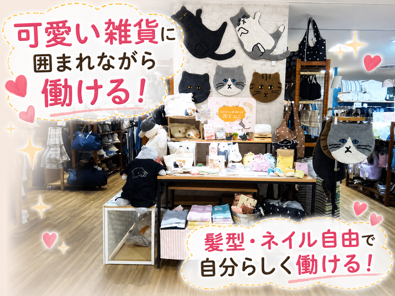 求めている人材 <経験・年齢・ブランク一切不問!> 未経験からスタートしたスタッフも多数活躍中です。 【こんな方にピッタリのお仕事です】 雑貨やお洋服など、可愛いものが大好きな方 人とコミュニケーションをとるのが好きな方 フルタイム(1日8時間・週5日)でしっかり稼ぎたい方 土日祝日の勤務が可能な方