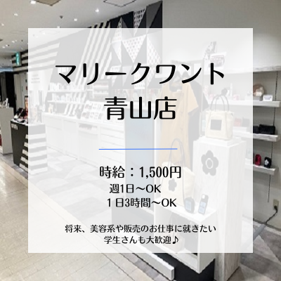 仕事内容 ⭐マリークワントショップでの化粧品・アパレル雑貨の販売⭐ コスメやファッション・アクセサリーなどの 多彩な商品をお客様にご案内するお仕事です。 ≪具体的には…≫ ⏩お客様へコスメ、ファッション商品のご提案 ⏩店舗のレイアウト変更 ⏩商品や備品の補充 ⏩店舗の清掃 etc. タッチアップの業務はないので 未経験の方でも安心してお仕事できます。 \こんな方にオススメ/ 学生・フリーターなど20~30代中心に活躍中!! 将来、美容系や販売のお仕事に就きたい 学生さんも大歓迎♪ 募集職種:アルバイト