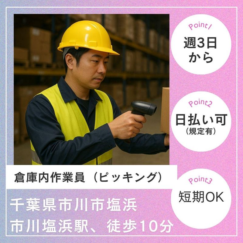 新浦安駅から徒歩!短期、日払い可!週3日OK!軽作業!梱包!