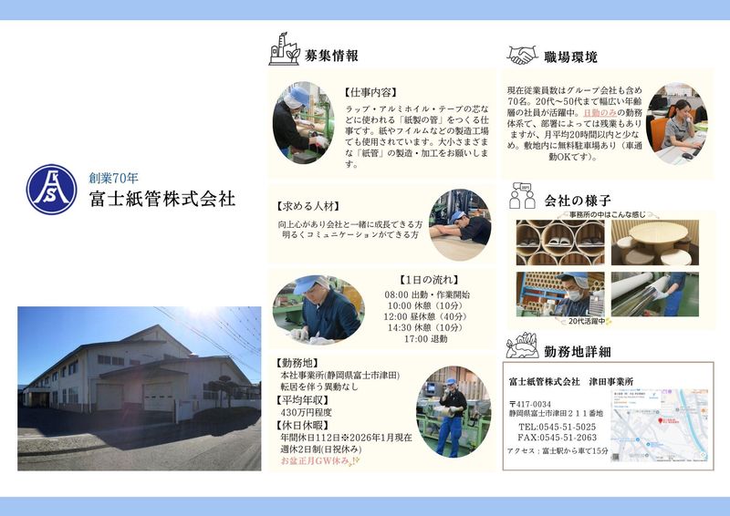 仕事内容 【日勤のみ】未経験OK!紙製品の製造スタッフ 定時退社多め/ボーナス年3回/20代活躍中 ⭐日勤のみで生活リズム安定 ⭐定時退社が多いから、平日も自分の時間がある ⭐ボーナス年3回支給で収入も妥協しない ⭐未経験から専門技術が身につく ⭐20代でも役職を目指せる評価制度 ▶「ガッツリ稼ぎたい人」も 「ワークライフバランス重視派」も どちらも歓迎です。 ✅仕事内容  ̄ ̄ ̄ ̄ ̄ ̄ ̄ ̄ ̄ ̄ ̄ ̄ ̄ ̄ ̄ ̄ ̄ 勤務地は富士紙管株式会社・本社事業所。 私たちが作っているのは、 ラップやアルミホイルの芯として使われる**「紙管」**です。 当社はそれだけでなく、もっと大きい紙管も作っています。 普段は目立たないけど、 なくなると困る。 そんな製品をつくる仕事です。 ✅具体的な仕事内容  ̄ ̄ ̄ ̄ ̄ ̄ ̄ ̄ ̄ ̄ ̄ ̄ ̄ ̄ ̄ ̄ ̄ ⭐紙管の製造(機械オペレーター) ・専用機械の操作・監視 ・材料を機械へセット ・仲間と声をかけ合いながら作業 ※重い紙管を扱う工程もあります ※平均残業20時間は以内 「今日はちゃんと働いたな」と 手応えが残る仕事です。 ⭐紙管の加工(カット作業) ・お客様の指定サイズにカット ・操作は機械メイン ・体への負担は比較的少なめ ※ 女性社員も活躍中 ※ 定時退社が多い部署です ※製造・加工ともに作業は機械が行いますが、機械に運ぶまでは人の手で行います。 ✅1日の流れ  ̄ ̄ ̄ ̄ ̄ ̄ ̄ ̄ ̄ ̄ ̄ ̄ ̄ ̄ ̄ ̄ ̄ 08:00 出勤・作業開始 10:00 休憩(10分) 12:00 昼休憩(40分) 14:30 休憩(10分) 17:00 退勤 ✅働きやすさも、ちゃんとある!  ̄ ̄ ̄ ̄ ̄ ̄ ̄ ̄ ̄ ̄ ̄ ̄ ̄ ̄ ̄ ̄ ̄ ・終業17:00でプライベート充実 ・無料駐車場あり/車通勤OK ・作業服貸与 ・安全靴・インナーは会社から購入可(一部自己負担) さらに・・・互助会制度あり 年1回の互助会旅行で、部署を越えた交流も。 ✅キャリアアップ  ̄ ̄ ̄ ̄ ̄ ̄ ̄ ̄ ̄ ̄ ̄ ̄ ̄ ̄ ̄ ̄ ̄ 年齢は関係ありません 富士紙管では 「やる気」と「姿勢」をちゃんと見ます。 ・中途入社でも中心メンバーになれる ・頑張り次第で役職登用あり ・入社1年目以降、フォークリフト免許を会社負担で取得可 「分からないまま放置」はしません。 必ず誰かがフォローします。 ✅社員のリアルな声  ̄ ̄ ̄ ̄ ̄ ̄ ̄ ̄ ̄ ̄ ̄ ̄ ̄ ̄ ̄ ̄ ̄ ・製造部 製造課/服部係長(32歳) 「年齢や社歴に関係なく、 やる気があれば任せてもらえる会社です。 困ったときは必ず誰かが助けてくれます。」 ・製造部 製造課/Aさん(21歳) 「入社して日が浅くても、 頑張りをちゃんと見てもらえていると感じます。 忙しい時もありますが、やりがいがあります。」 ✅富士紙管について  ̄ ̄ ̄ ̄ ̄ ̄ ̄ ̄ ̄ ̄ ̄ ̄ ̄ ̄ ̄ ̄ ̄ ・全国でも約70社しかない紙管メーカー ・業界 トップクラス(規模7位) ・グループ全体で従業員約70名 ・業績安定+成長中 ボーナス年3回だから 「将来の安心」も、ちゃんとあります。 ✅最後に  ̄ ̄ ̄ ̄ ̄ ̄ ̄ ̄ ̄ ̄ ̄ ̄ ̄ ̄ ̄ ̄ ̄ 「安定」も「成長」も、どっちも欲しいあなたへ。 でもそれだけじゃ、ありません。 富士紙管は 「ちゃんと稼げて、ちゃんと生活できて、ちゃんと評価される」 ―そんな職場を本気でつくっています。