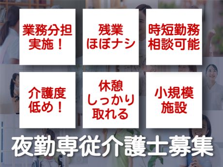 実働13時間夜勤!業務分担実施だから残業ほぼナシ|週2回~|見回りスタッフ在籍!しっかり休憩できます
