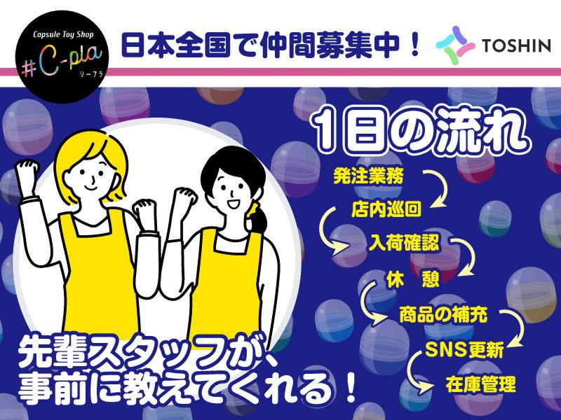 アピールポイント: 【接客スキルが身につきます】 様々な年齢のお客様対応をするため、聞く力・説明力・臨機応変な対応力が養われます。 コミュニケーション力に自信がある方にもピッタリです! 【経験不問!わかりやすい新人研修あり】(新人研修・OJT研修有) 先輩スタッフによる新人研修からスタートしていただきます! 作業の流れ・作業における注意点・わからないことは何でも相談できる環境の中で学んでいただきますので、無理なく始められますよ! 【キャリアUPに挑戦!】 アルバイト・パートスタッフにも規定にもとづいた昇給制度をご用意しております。 前向きに仕事へ取り組む姿勢や頑張りなどをきちんと評価するので、アルバイト勤務でも店長(正社員)を目指すことができます。 誰でも時給アップやキャリアアップのチャンスに恵まれている職場です。 【売り場づくりなど個性を活かして働くこともできます】 #C-pla(シープラ)では、ご自身の発想や個性が活かせる店舗の売り場づくりもお願いしています! キットを組み立てて作成するフォトスポットなど、簡単な店内展示物を作ることからおまかせいたします。 慣れてきたら、POP作りやディスプレイの管理などもお願いいたします! 【同じ趣味をもった新たな友達もできる環境】 #C-pla(シープラ)では、カプセルトイが好き!アニメのキャラクターが好き!というメンバーが多くいますので、 同じ共通点があることでお互いに話しやすい環境も作りやすいのがポイントかもしれません!